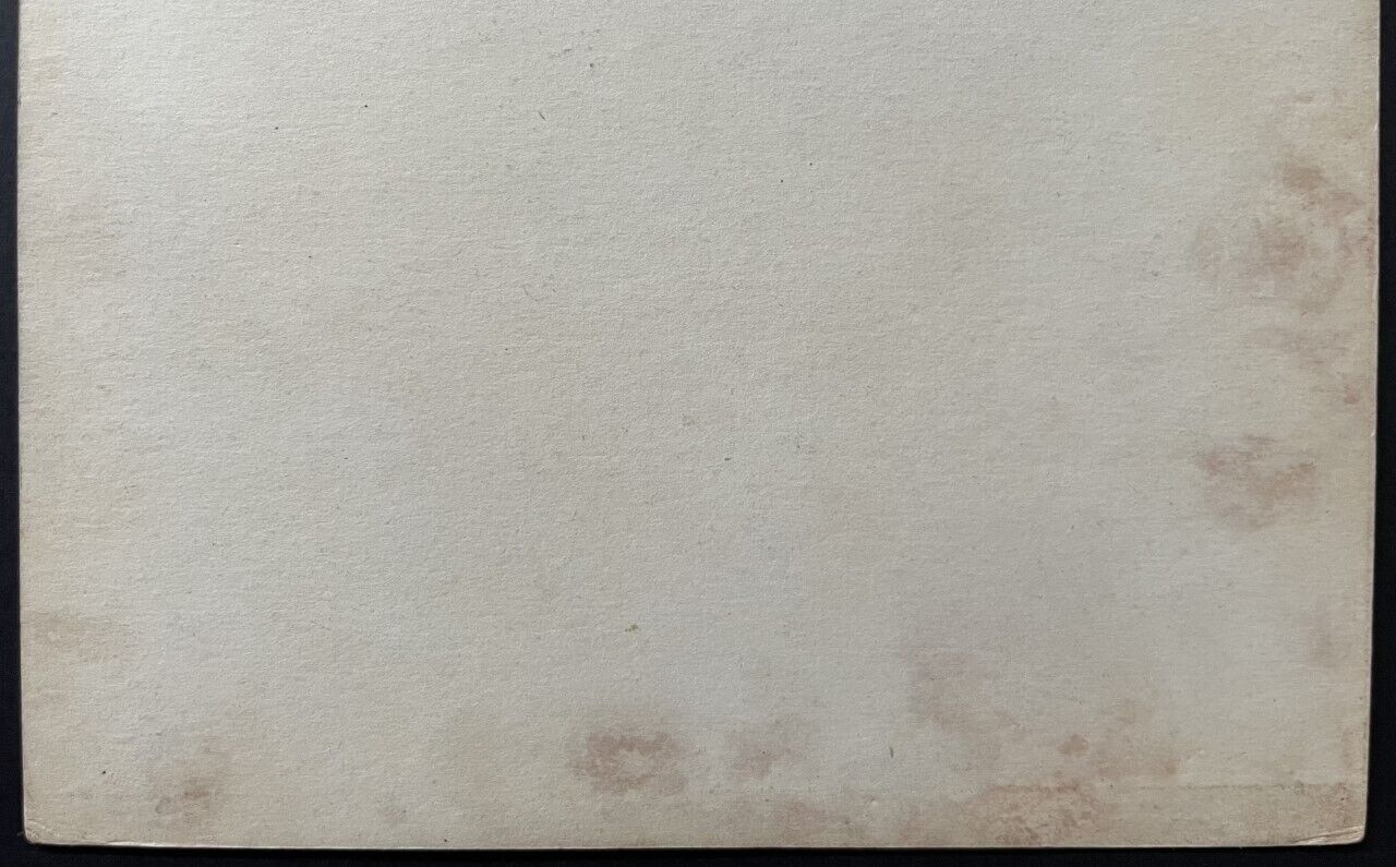 - Very good condition; notable crease near top left corner as well as general edgewear throughout - light soiling along the margins and discolouration along the bottom edge. Chipping in bottom right corner. Some notable paper separation in bottom left corner. Image still presents very well. Writing in pencil near the top of the back side and soiling along the edges visible from the back, most notably along the bottom and right edges.