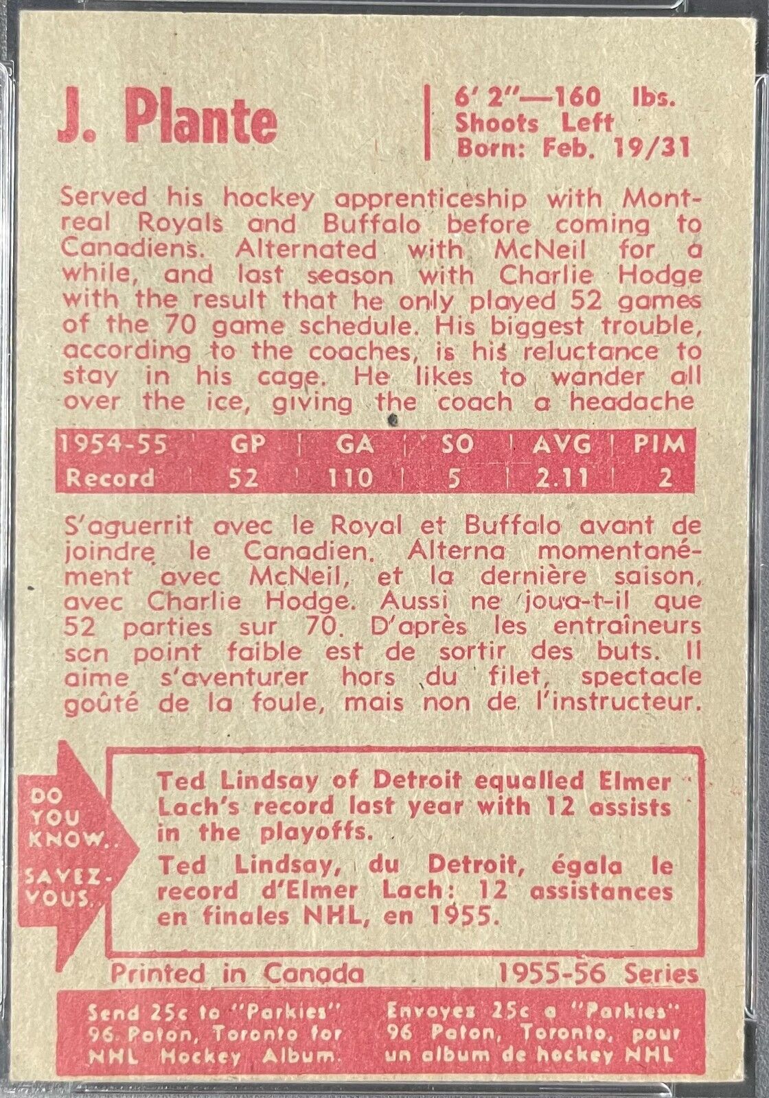 1955 Parkhurst #50 Jacques Plante Montreal Canadiens NHL Hockey RC PSA 6 EX-MT