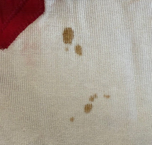 • Jersey in excellent condition; a few brown stains on front of jersey (possibly blood). Some red dye has faintly bled throughout various parts of the jersey. Buttons and seams are all intact. Autograph/inscription presents well with no fading, smudging or bleeding. Card displays some minor paper material loss on reverse. Photo displays some minor corner and edge wear and some faint surface creasing. Two small tears on the left and right edge