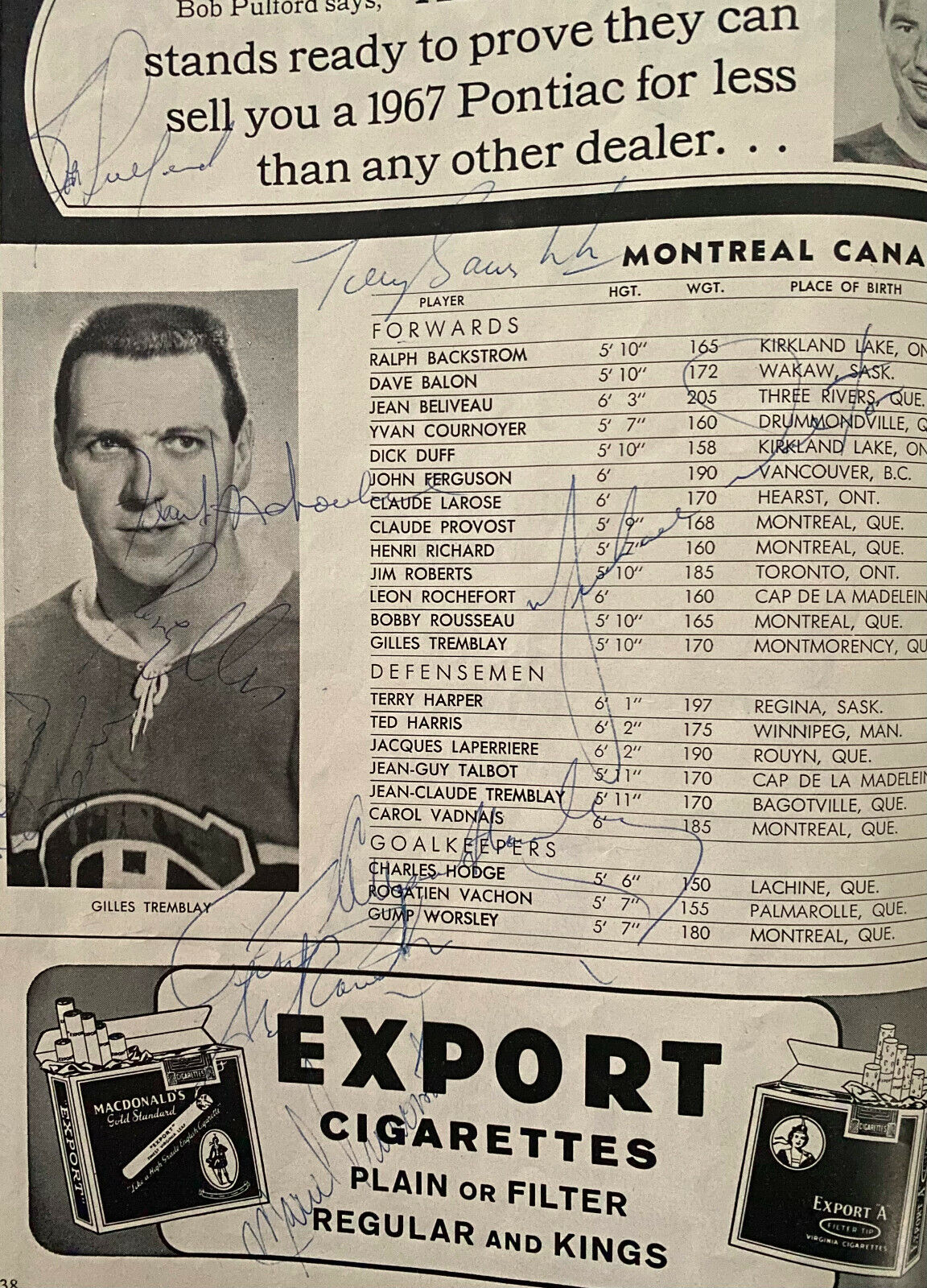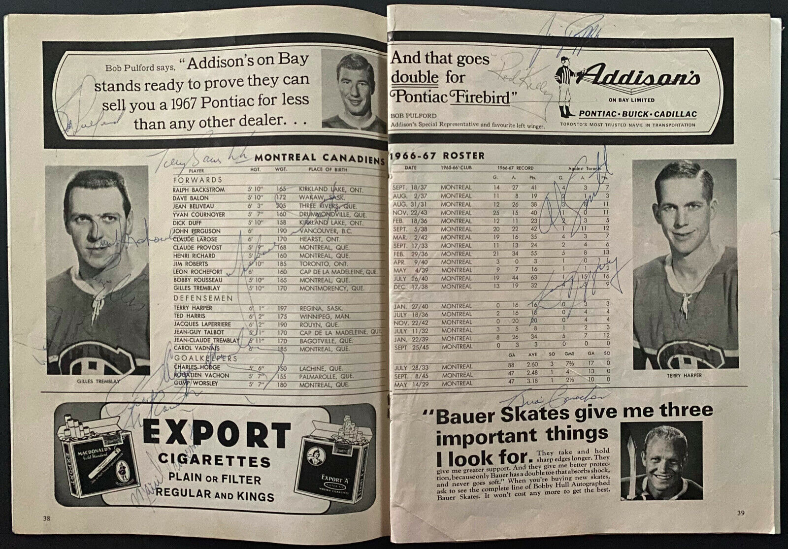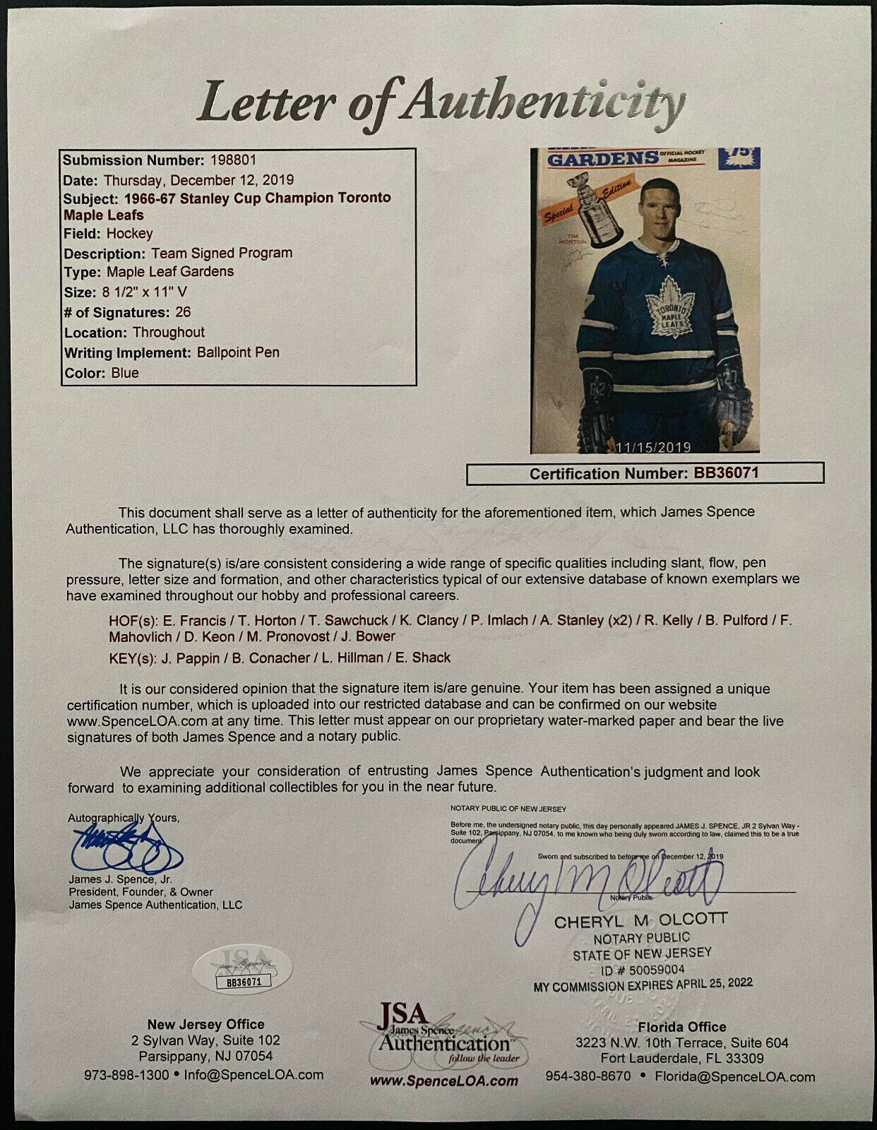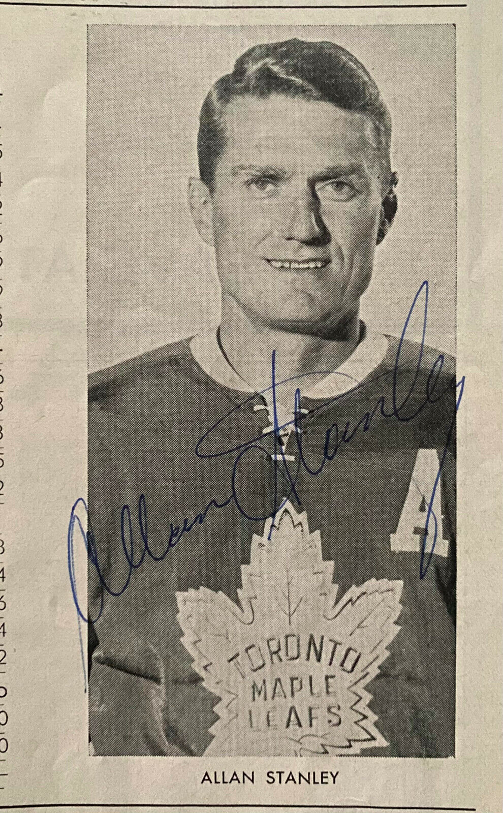 - Signtures include: Punch Imlach HOF coach on the front cover, King Clancy HOFer assistant GM on the centre lineup page, Bob Davidson former Leaf player and current chief scout on the centre lineup page, Tim Horton front cover, Jim Pappin front cover, Larry Hillman centre lineup page, Johnny Bower HOFer centre lineup page, Ed Shack centre lineup page, Allan Stanley HOFer Pg #43 on his photo + Pg 38, Terry Sawchuk HOFer Pg #38, Marcel Pronovost HOFer Pg #38, Bob Pulford HOFer Pg #38, Frank Mahovlich HOFer Pg #38, Michael Walton Pg #38, David Keon HOFer Pg #38, Ron Ellis Pg #38, Al Smith Pg #39, Jim Pappin Pg #39, Larry Jeffrey Pg #39, Brian Conacher Pg #39, Red Kelly HOFer Pg #39, Peter Stemkowski Pg #38