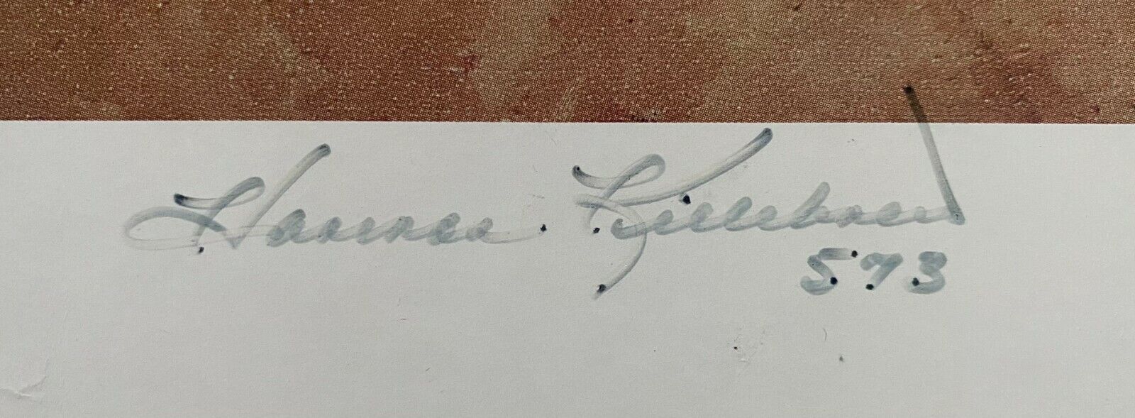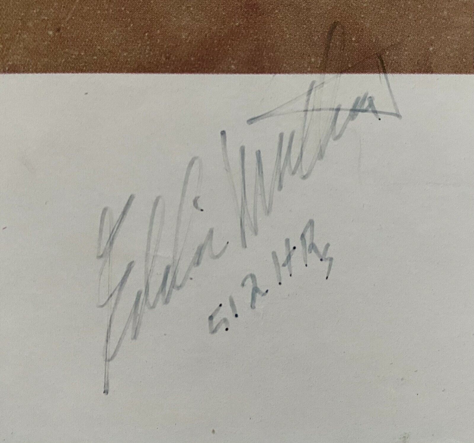 - Print is affixed to a cardboard backing and has some repairable peeling in the bottom left corner but otherwise little to no creasing and no rips or tears. Backing has some surface paper loss along the edges of the back as well, but the image and autographs present very nicely with no smudging or bleeding