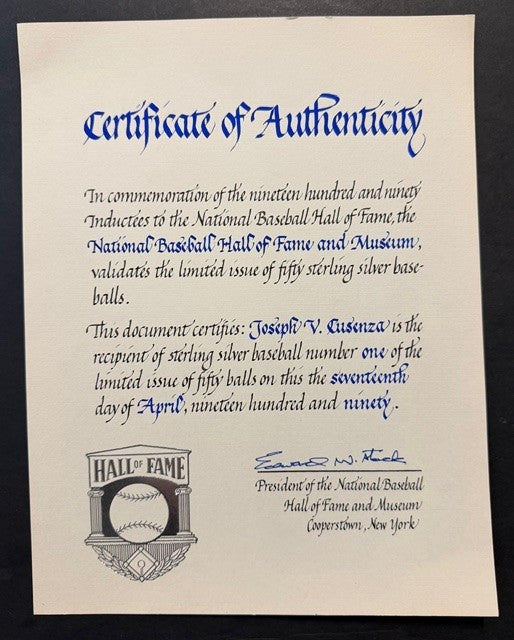 - Included with the sterling silver baseball is a Hall of Fame Letter of Authenticity, which specifies that this is the first of 50 issued