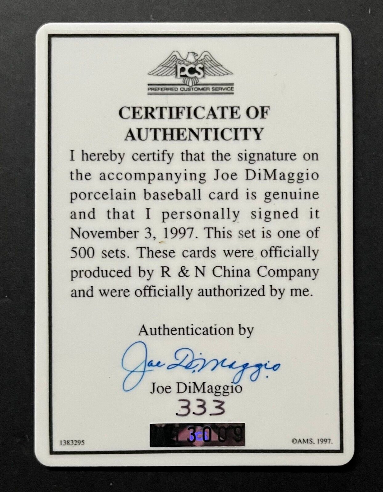 - COA / Authenticated by Joe DiMaggio signed November 3, 1997. COA is one of the cards, including a photograph of him at the time of signing.
