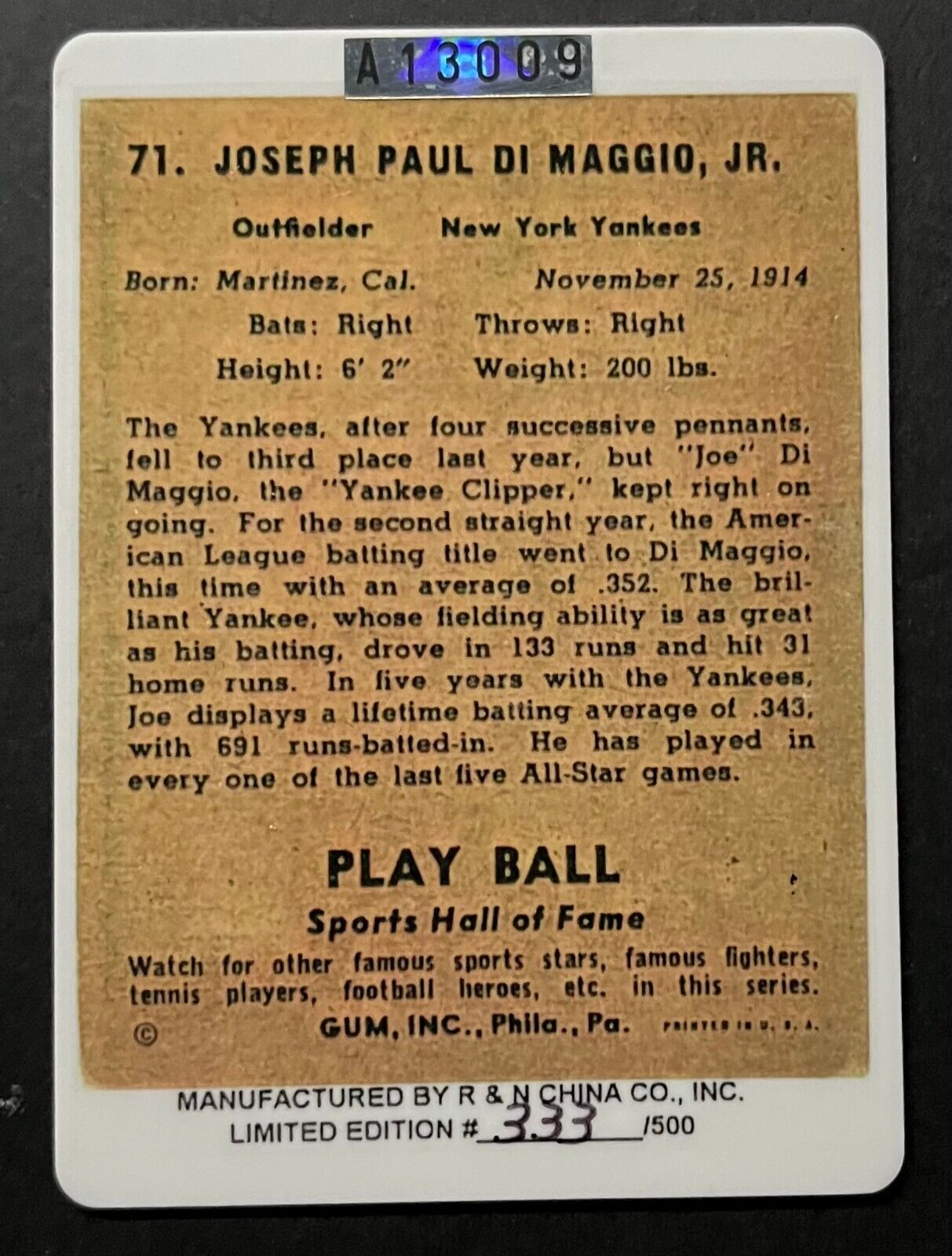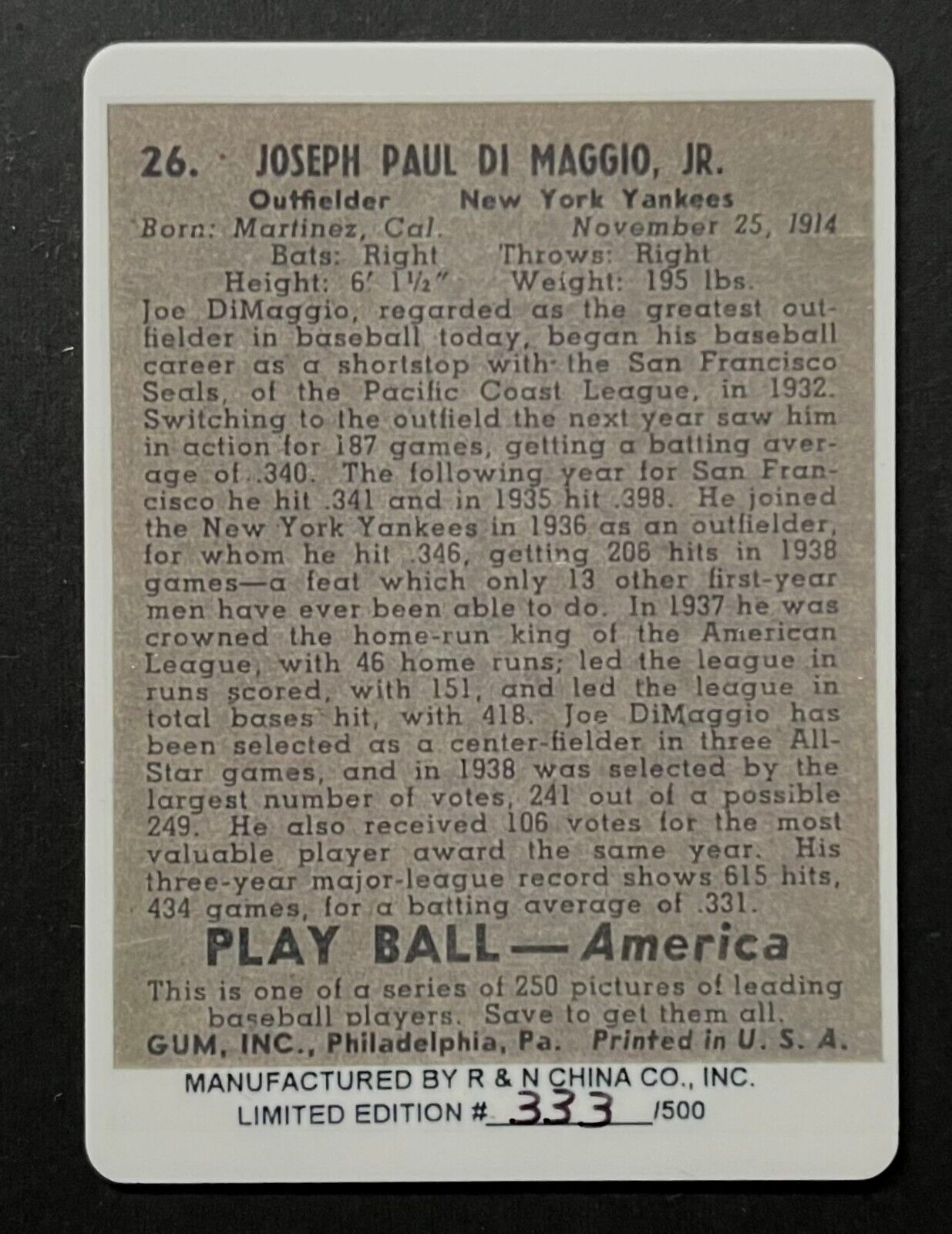 - Joe DiMaggio Porcelain baseball card set of 4 #333/500 with one card autographed by Joe DiMaggio
