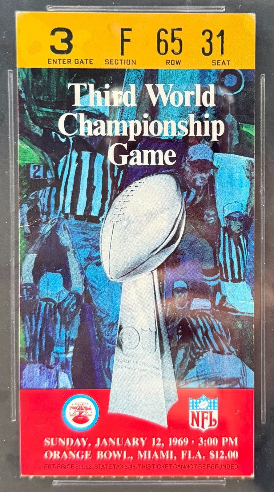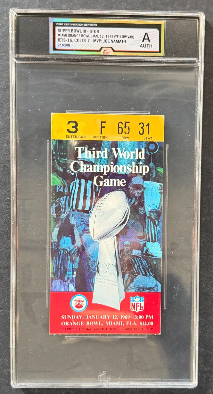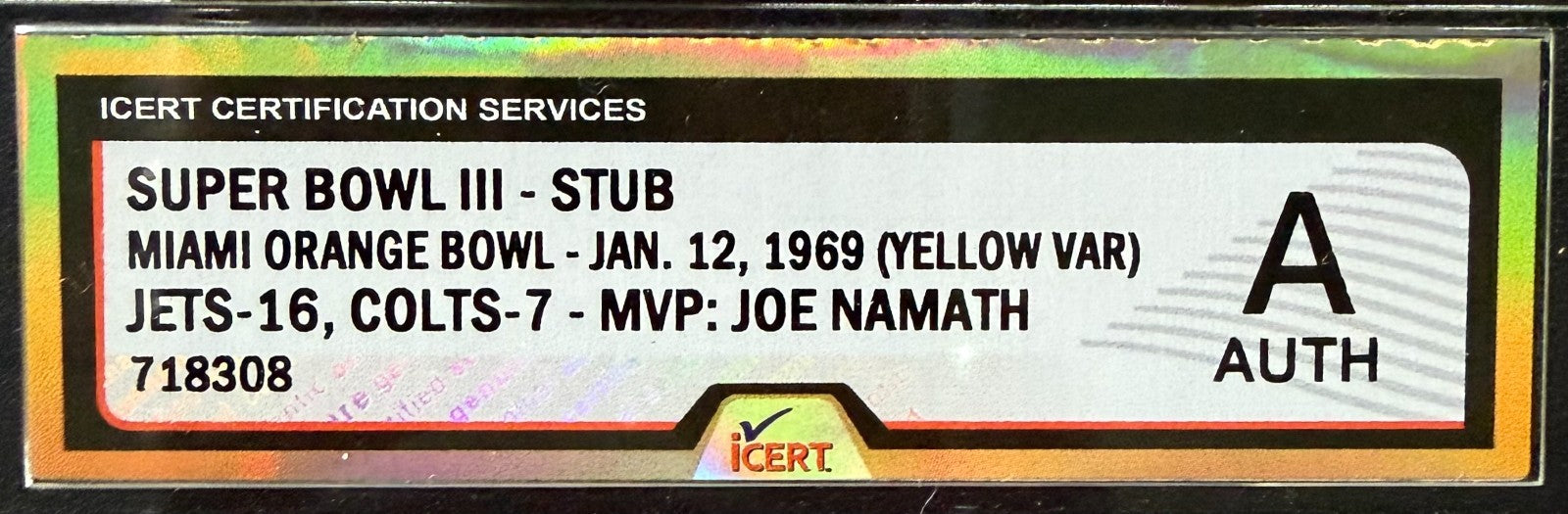 Super Bowl III Ticket Stub Yellow Var. Jets Colts Joe Namath MVP iCert A Miami