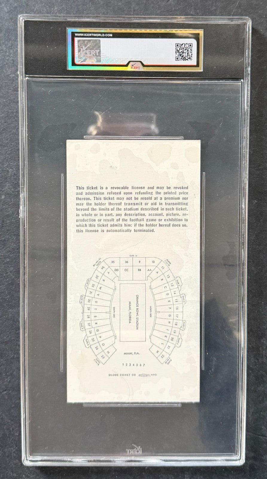 • Graded/slabbed iCert A Auth (Authentic). Excellent condition; one faint crease in middle of ticket and one on the right edge. Very minor corner wear. Edges are sharp and clean. Even entry tear. Some dark spots of discoloration on back of ticket. Ticket displays very well