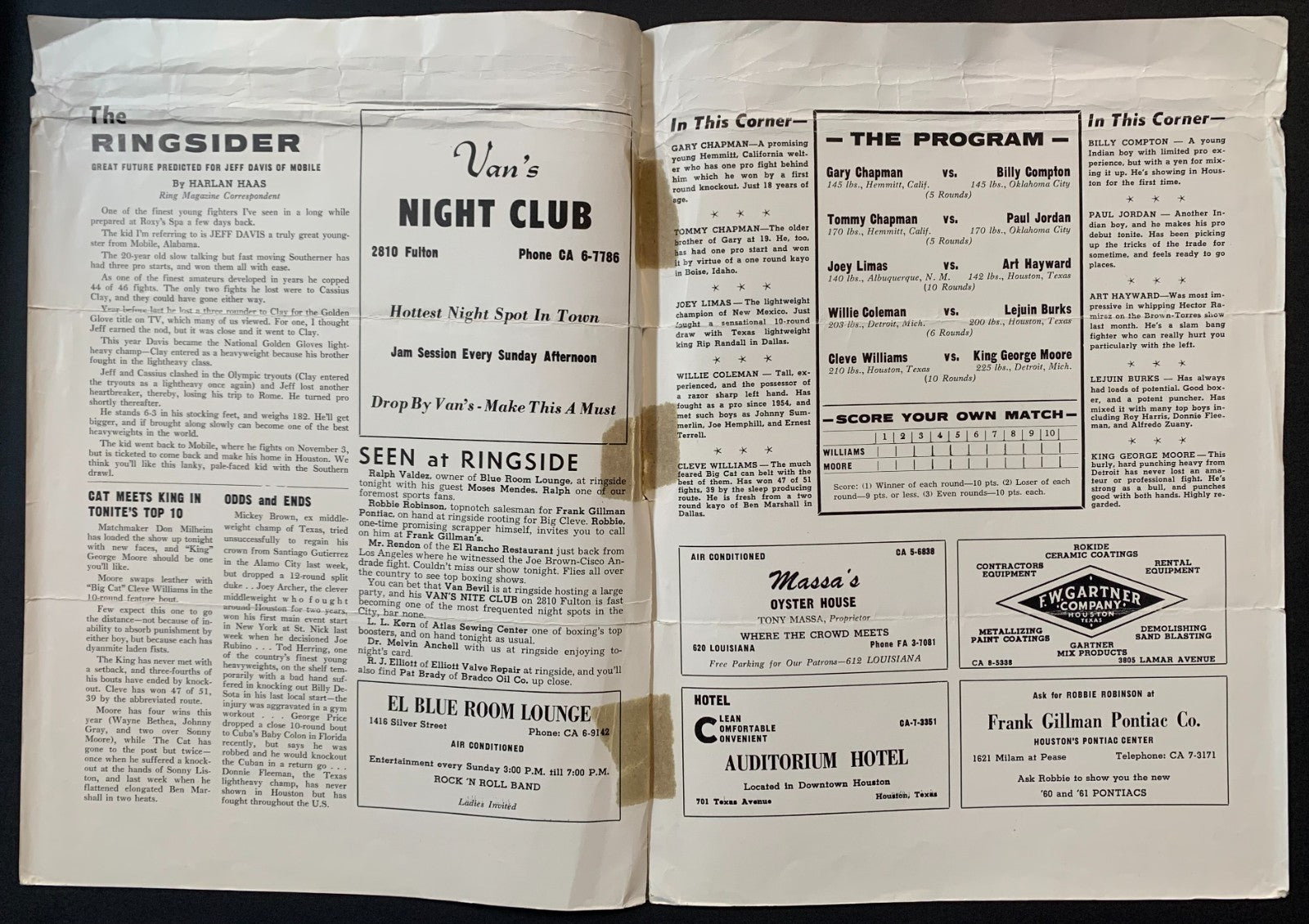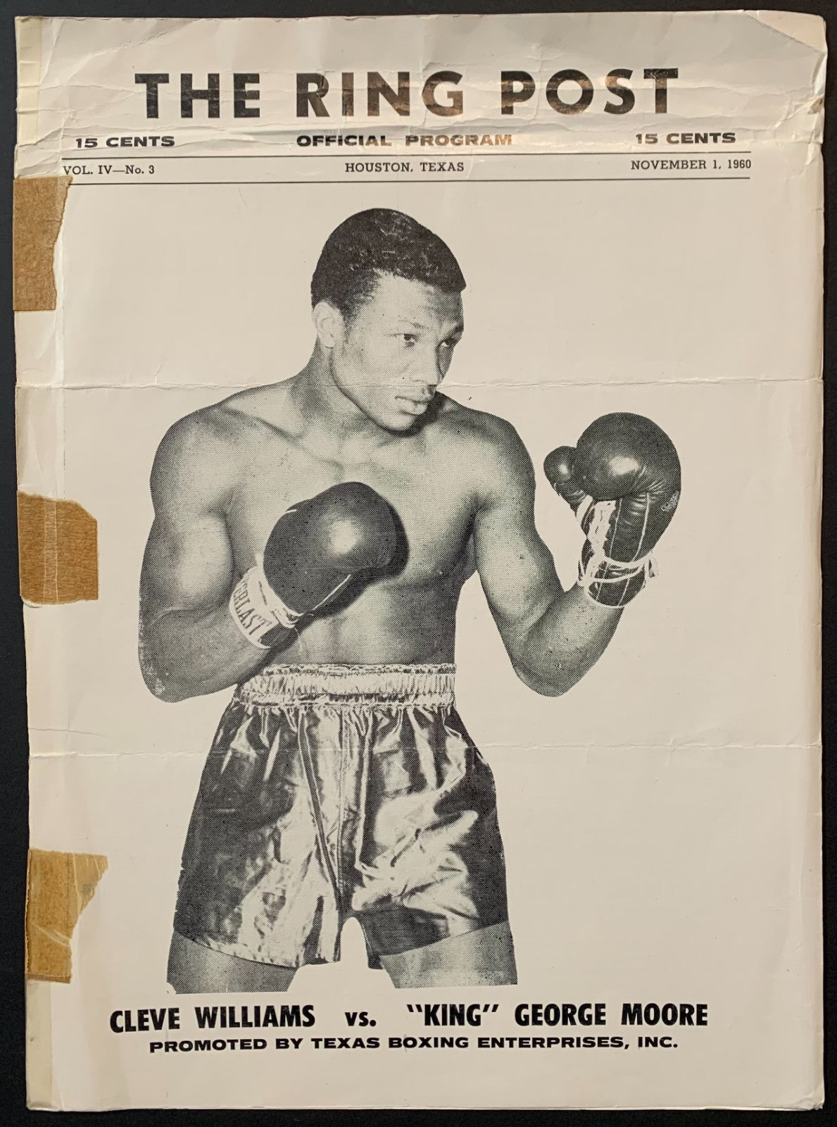• Original Nov. 1, 19060 boxing program at Houston, Texas for main bout between Cleveland Williams and King George Moore. Williams knocks out Moore in the 4th round