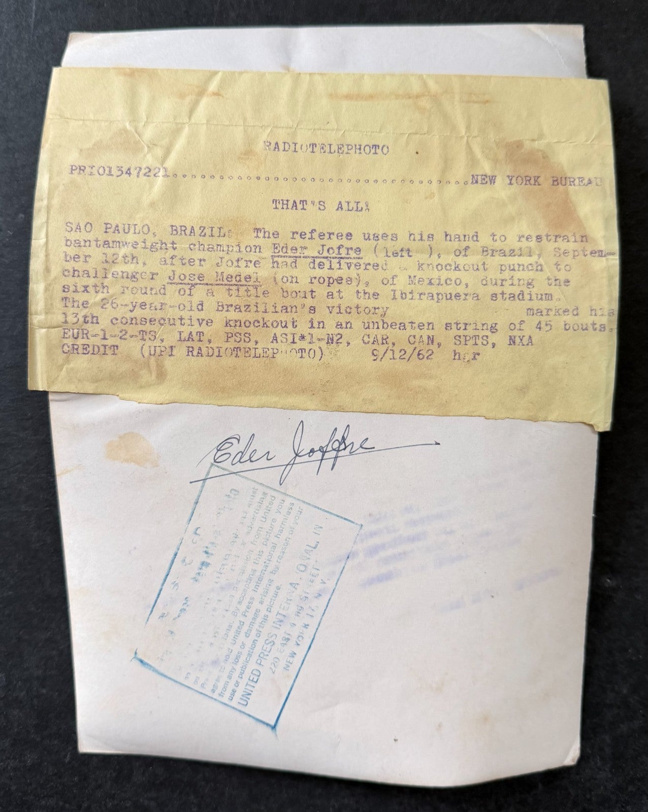 - Sept. 12, 1962 International Press photo of Eder Jofre knocking out Jose Medel and defending his bantamweight championship
