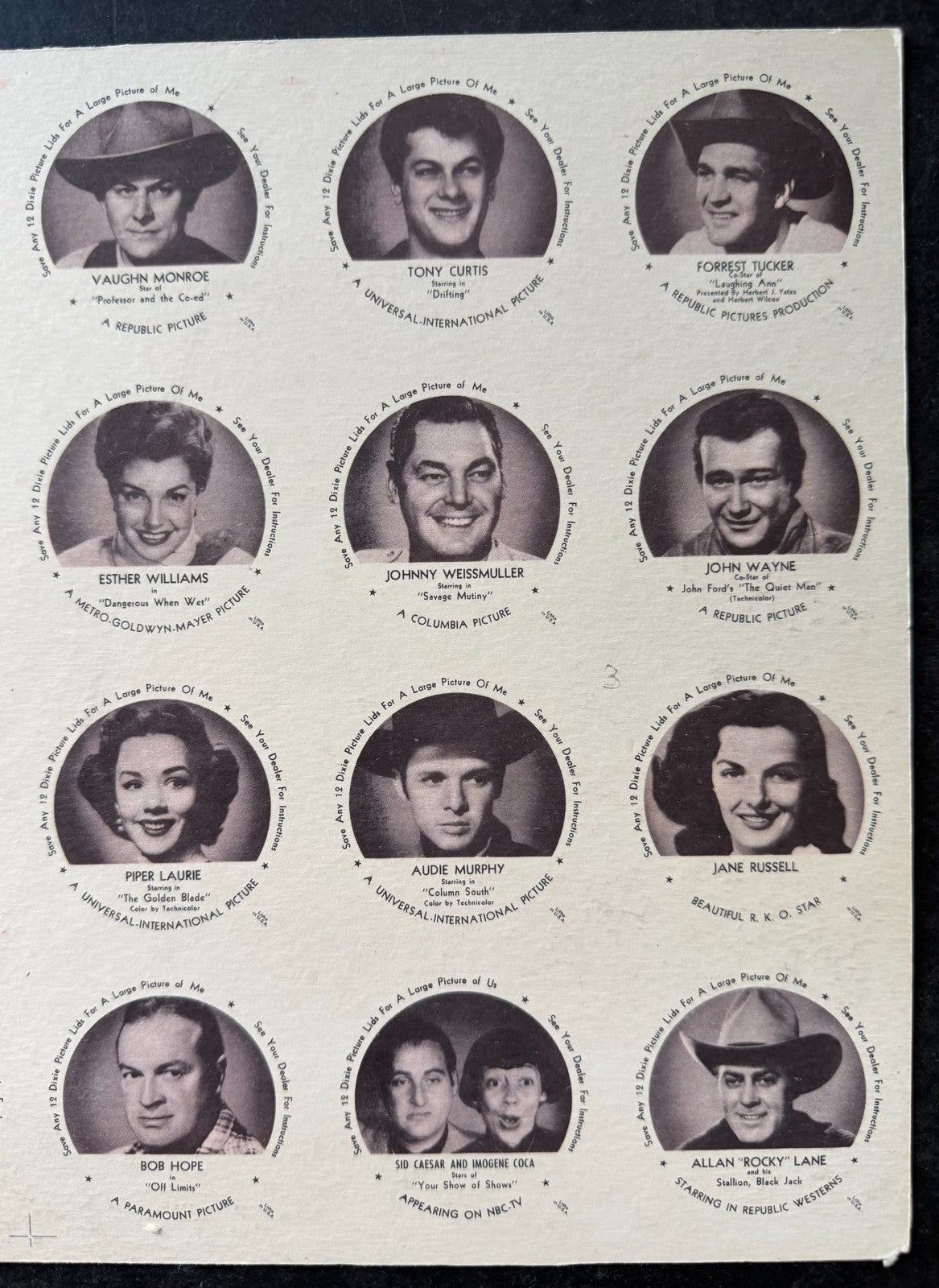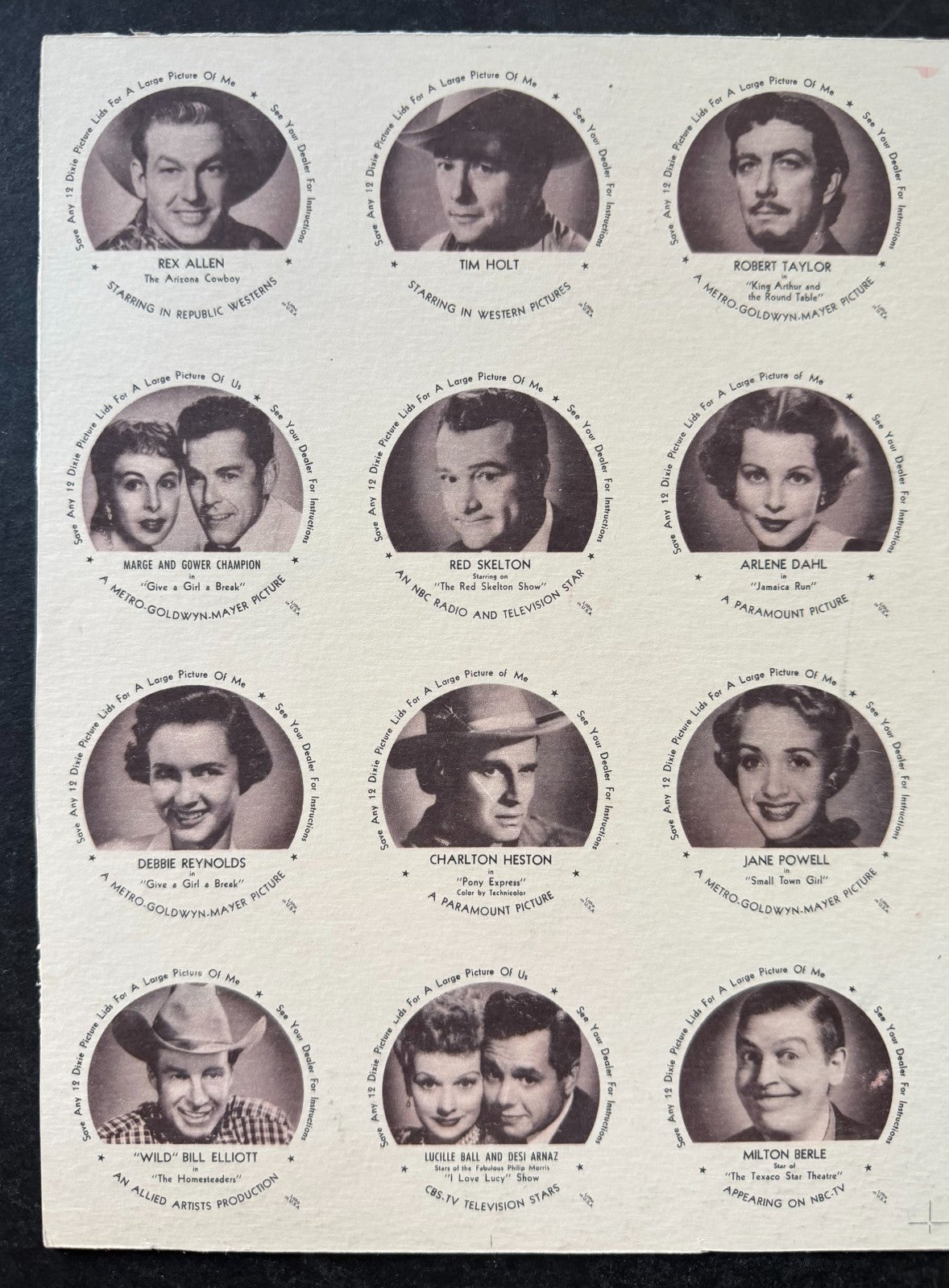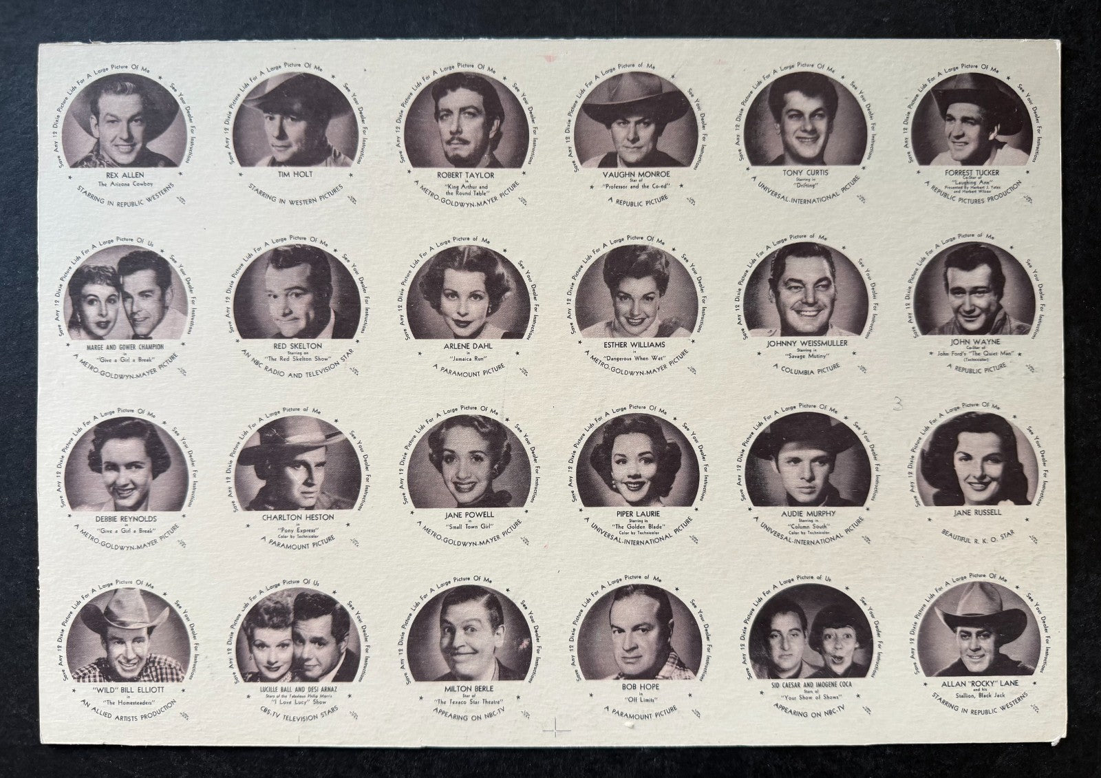 - 1953 Dixie Lids movie stars complete set uncut sheet