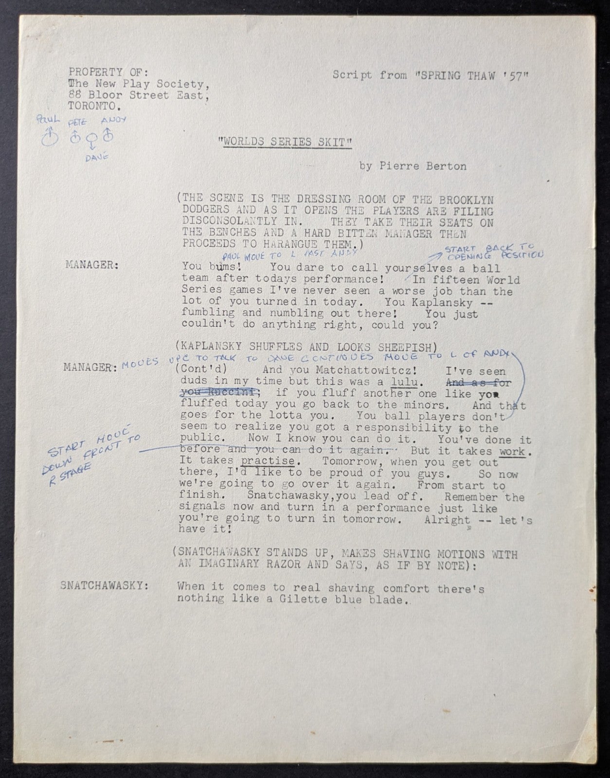 - Baseball skit written for theatre revue "Spring Thaw 57". Nice early item from famous Canadian author