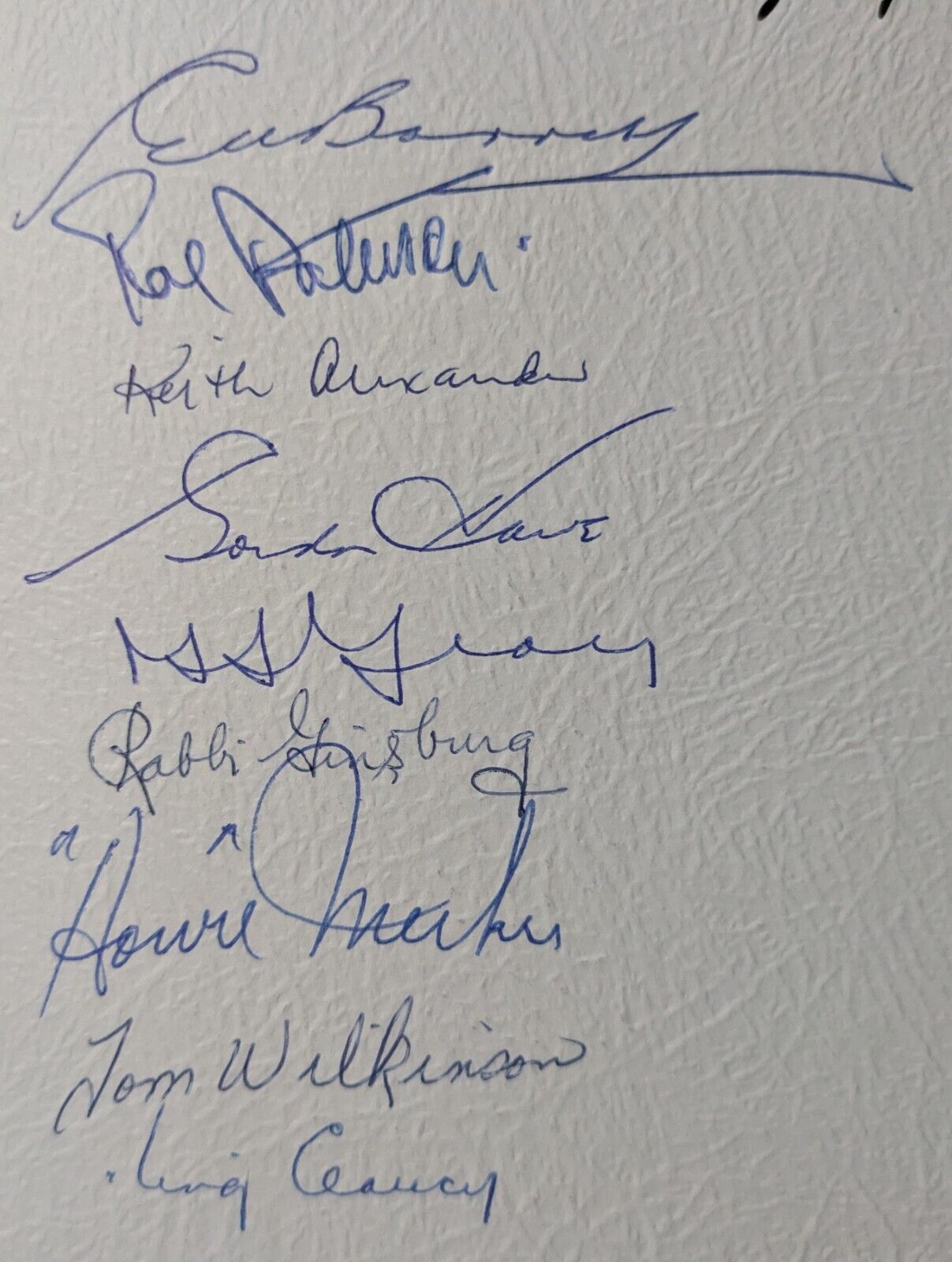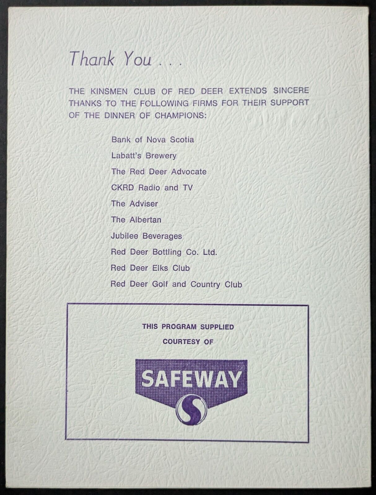 - Program is signed by: Gordie Howe (Hockey HOFer), King Clancy (Hockey HOFer), Howie Meeker (Hockey HOFer), Granville Liggins (CFL HOFer), Tom Wilkinson (CFL HOFer), Keith Alexander (golfer), Ed Barrett (Mayor of Red Deer, Alberta), Rae Patterson (Kingsmen Club President), Gordon Gray (President of the Kinsmen Dinner) and Rabbi Ginsberg of Calgary