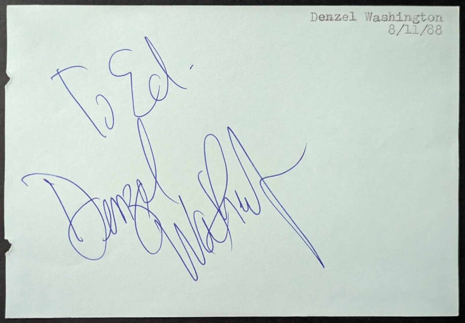 - Denzel Washington Autographed Cut Signed Index Card, authenticated by JSA