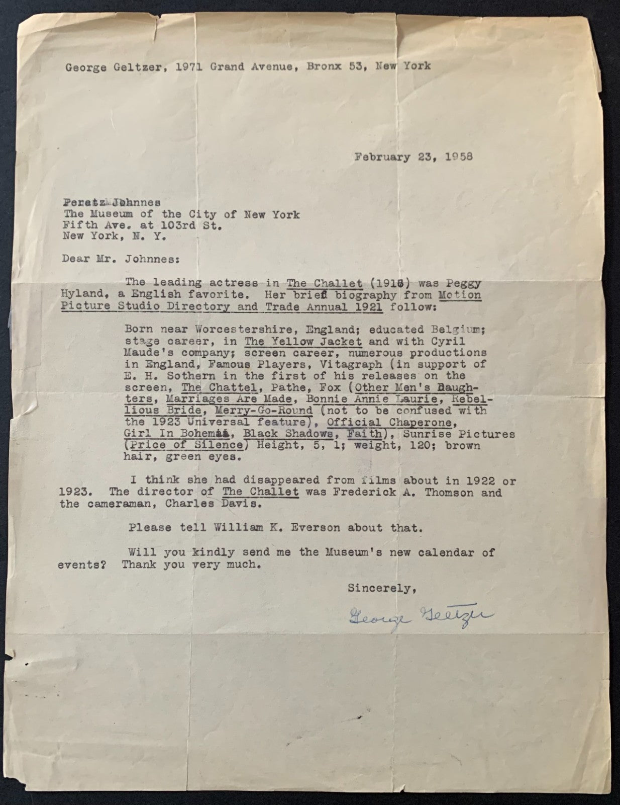 - Original letter signed by George Geltzer discussing silent film star Peggy Hyland