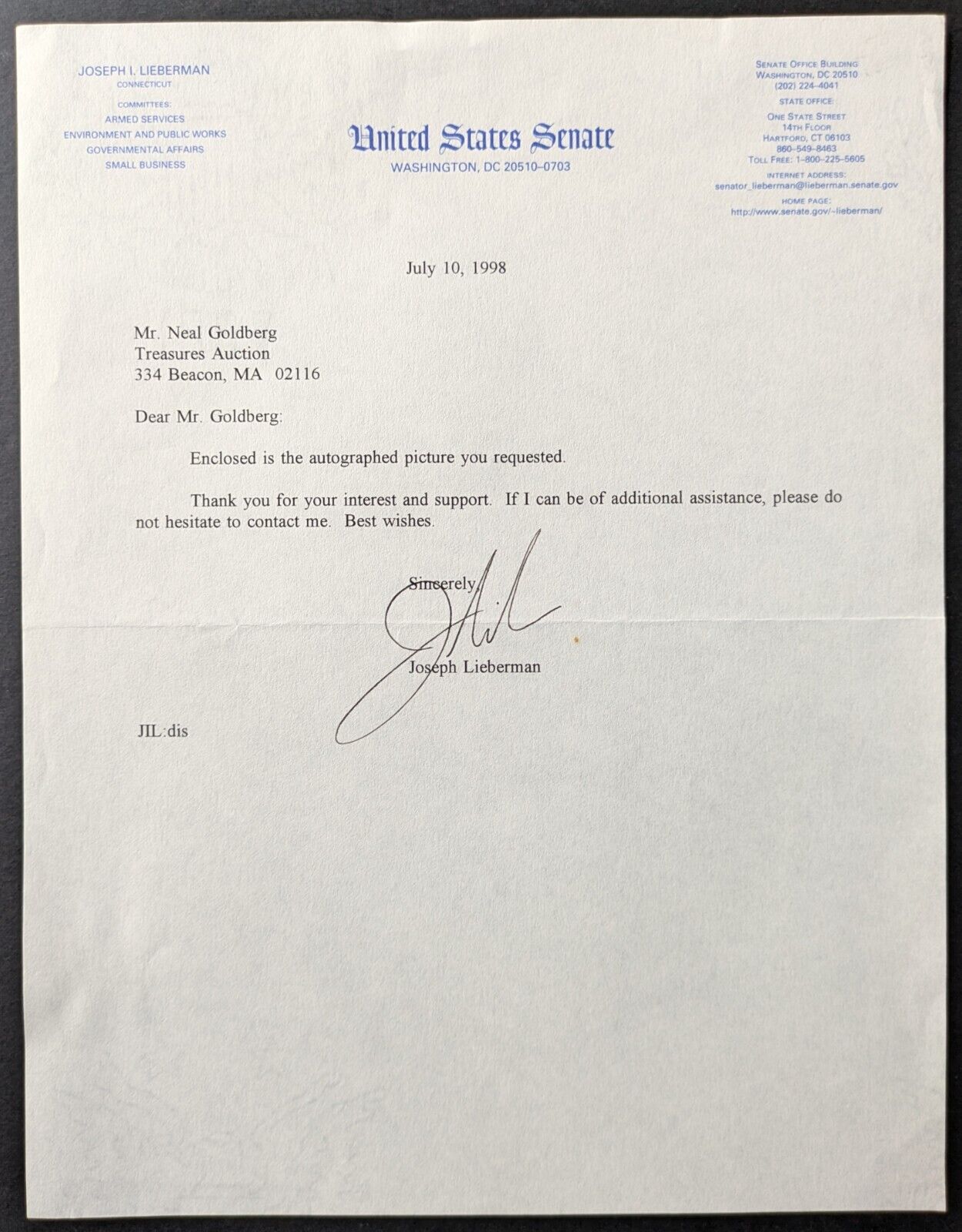 - Joe Lieberman signed autographed photo along with a typed letter on Senate letterhead also signed by Lieberman