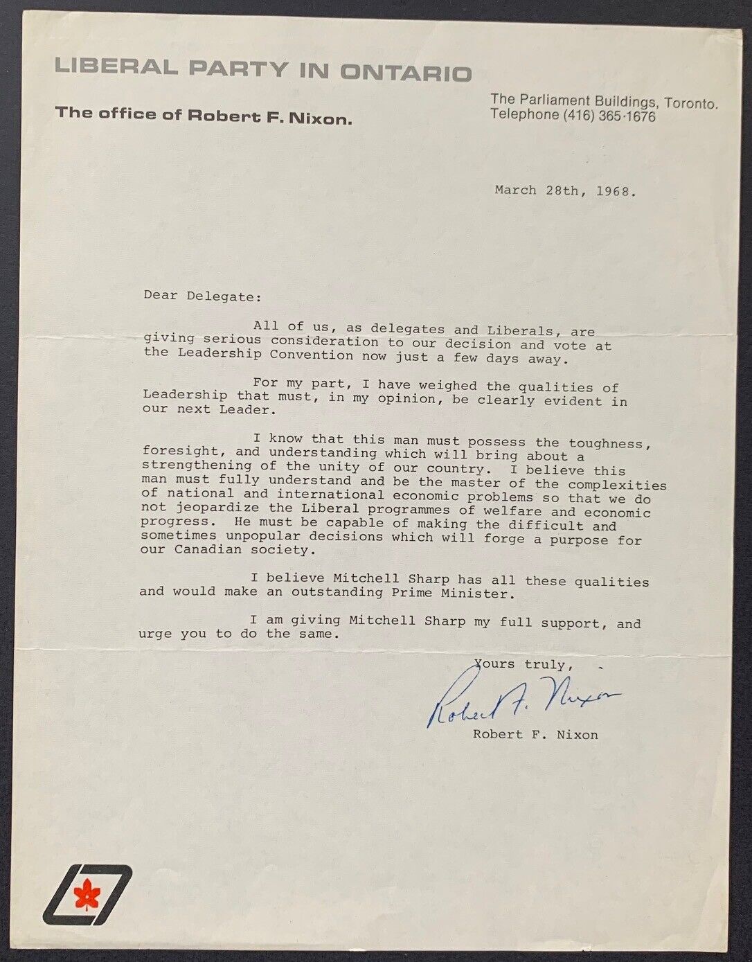- March 28, 1968 Ontario Liberal Party Leader Robert Nixon signed letter