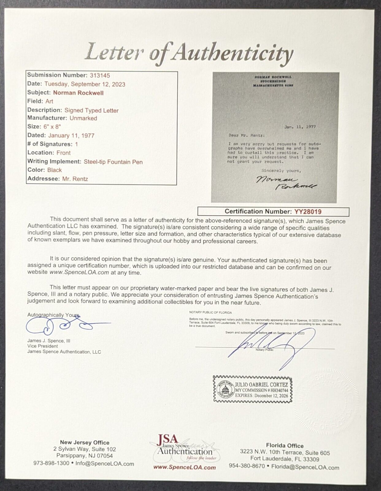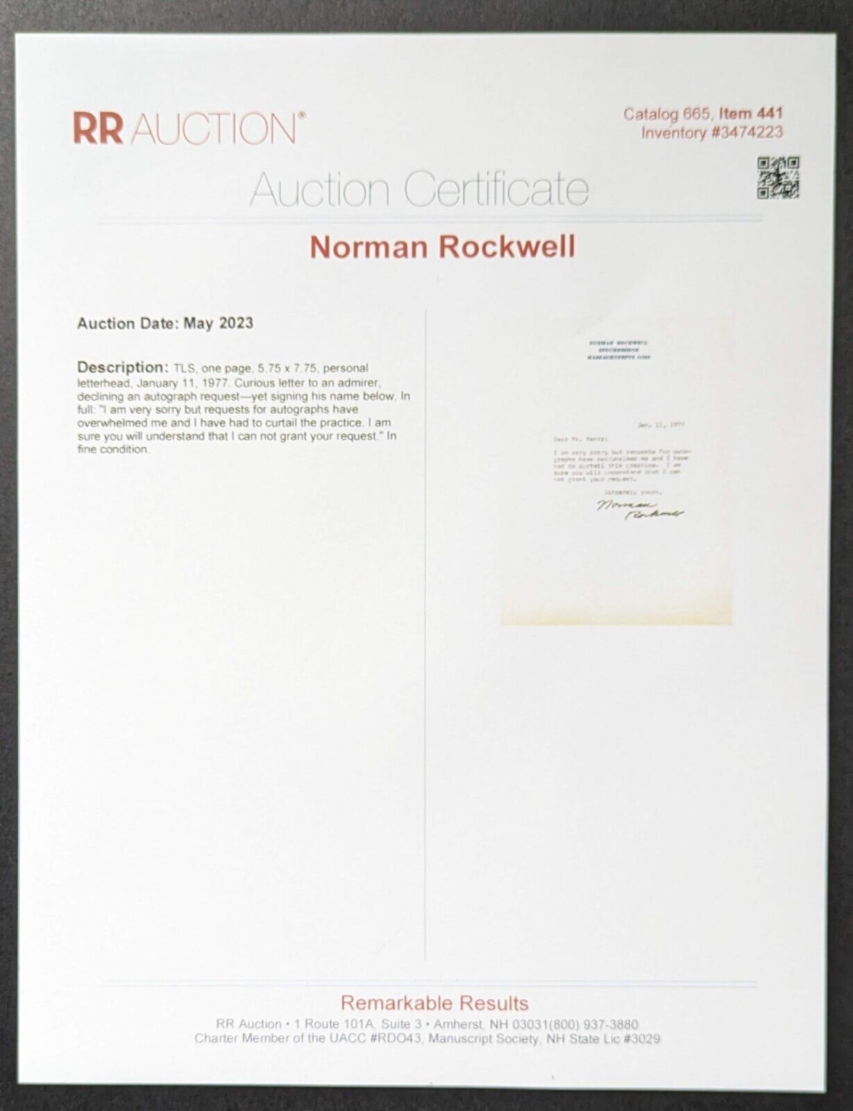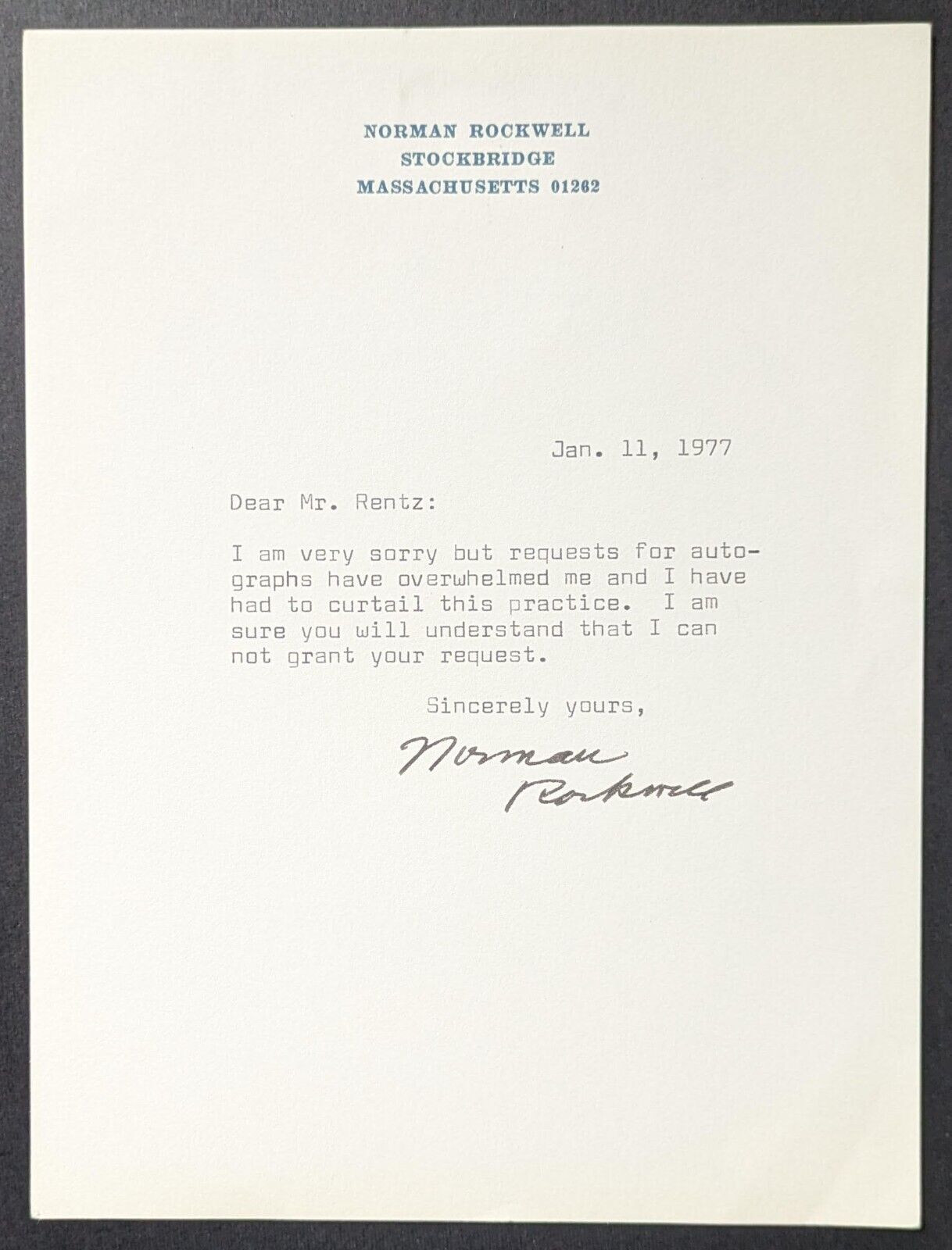 - Dated January 11th, 1977 and written on his personal letterhead, this letter is an amusing piece where Rockwell explains he will no longer be fulfilling autograph requests while still signing off at the end of the correspondence