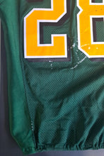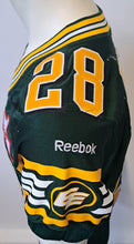 - From the 2012 season, this Reebok made jersey that displays a "12-42" year/size swatch sewn to the inner collar while a Reebok jock tag with a size "42" label is sewn inside the front hem. Sporting "Eskimos" embroidered over the upper chest, "28" in stacked tri-layer tackle twill numbers is sewn to the front, reverse and shoulders, with the Eskimos logos and striping over both sleeves in rubberized style. Additionally, there are also sponsorship crests over the left and right breasts. Displaying "Boyd" over the affixed matching nameplate on the reverse in dual layer yellow-over-white letters, the jersey displays excellent game-use through numerous hit marks and paint transfers as well as pilling to the satin sides