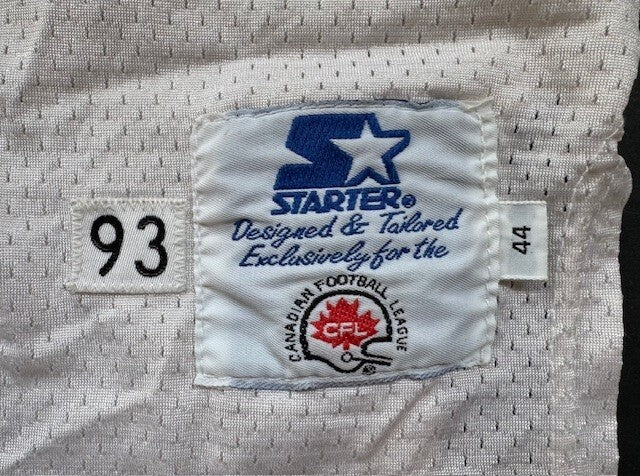 • Sewn name on plate. CFL Patch at neck. Starter tags in neck and tail. Tail also has a size 44 fly tag. Year patch 93 also sewn in tail