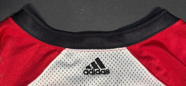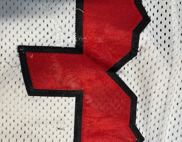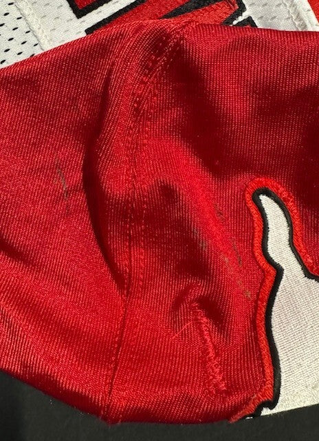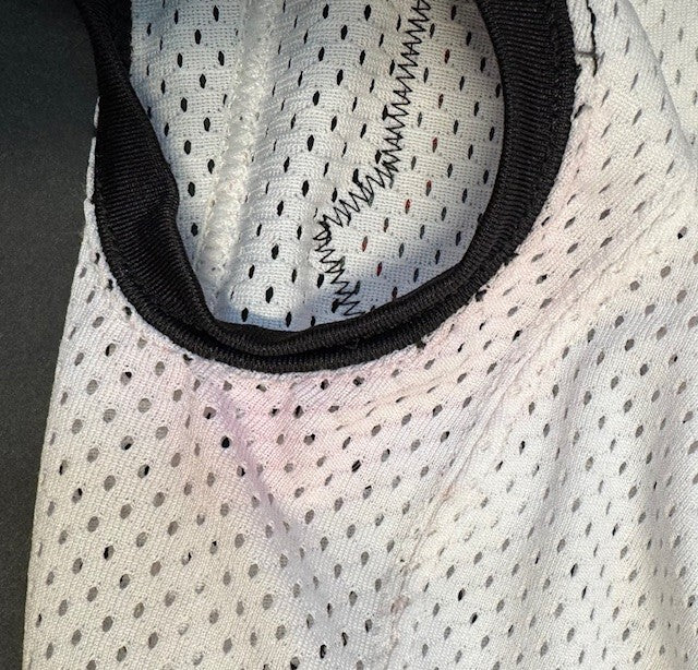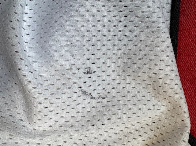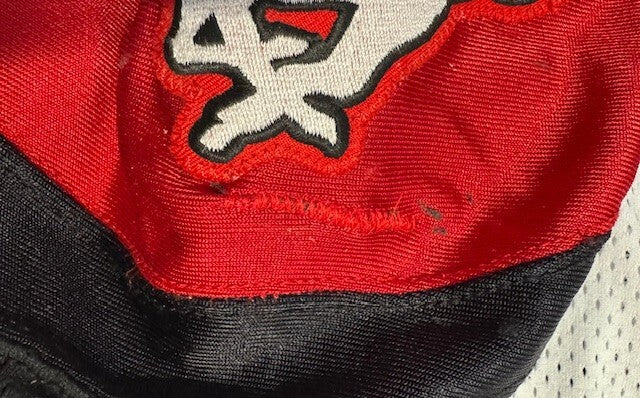 - Displaying heavy game-wear throughout including team repairs, hit marks, paint transfers, dirt marks/stains, light pilling on the interior and colour bleed underneath both armpits