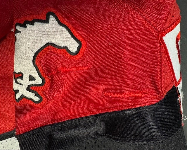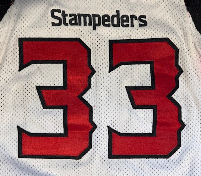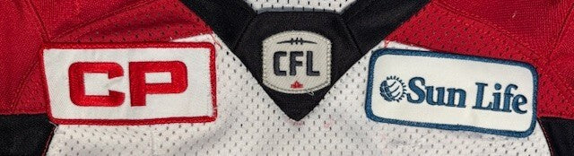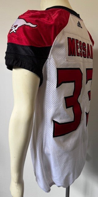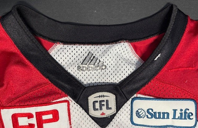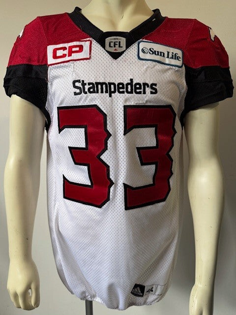 - Adidas jersey with brand label over the front hem which displays a size "44" designation, an additional "2 S.B." label is affixed to the jock tag as well while and Adidas logo is embroidered into the reverse neckline. Sporting a CFL league patch at the base of the collar with Stampeders logo patches appearing over both shoulders. "Stampeders" is embroidered into the front of the jersey while sponsorship patches for both Sun Life and CP (Canadian Pacific) appear sewn on over the left and right breast respectively. Styled over the front and reverse with Messam's number "33" in dual layered red-over-black tackle twill numerials, "Messam" is spelt out in matching style letters across the affixed matching mesh nameplate at the top of the reverse.
