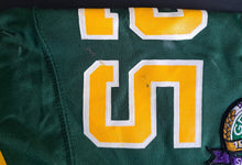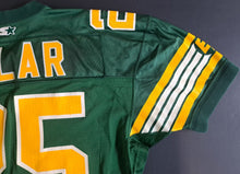 - Tagged size "46" over the front hem, a "94" year tag is sewn on in the same area and CFL plus Starter log patches have been added over the front and reverse necklines respectively. Sporting a Starter jock tag over the front hem, rubberized Eskimos logos and striping patterns are seen over both sleeves while front, reverse and both shoulders have ben styled with Lolar's number "28" in dual layer yellow-over-white rubberized number that remain in good condition with minimal cracking exhibited. Displaying "Lolar" in matching style rubberized letters across the affixed matching nameplate over the upper reverse, the 1995 Grey Cup patch worn by teams throughout the 1995 playoffs has been added over the right collarbone, suggesting the jersey was either reworn in 1995 after being worn the previous year or was patched as a backup. Showing excellent game-wear, hit marks and paint transfers are viewed over both shoulders and sleeves and well as on the upper reverse. Additionally, a team repair is observed just underneath the left shoulder numbers."