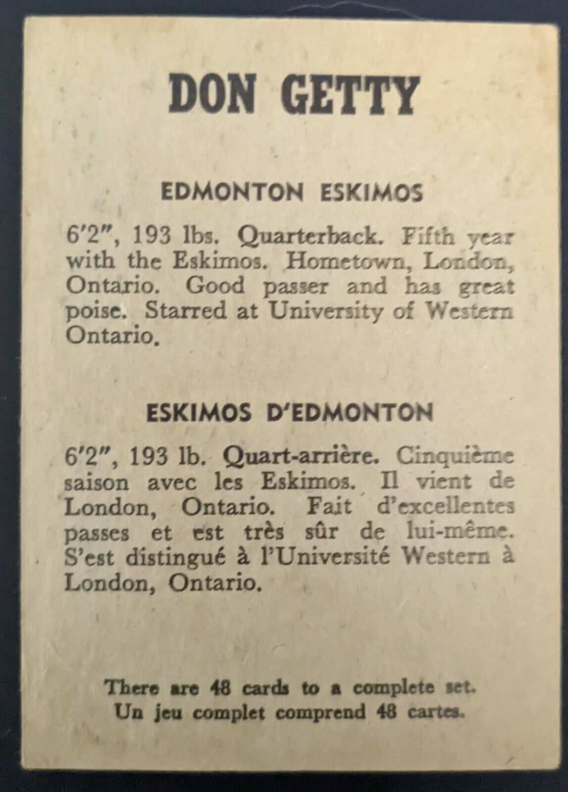 • 1959 General Mills Wheaties CFL Football Don Getty Edmonton Eskimos CFL Card (Rare issue)