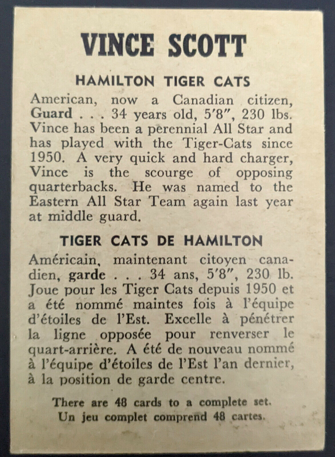- 1959 General Mills Wheaties CFL Football Vince Scott Hamilton Ti-Cats CFL Card