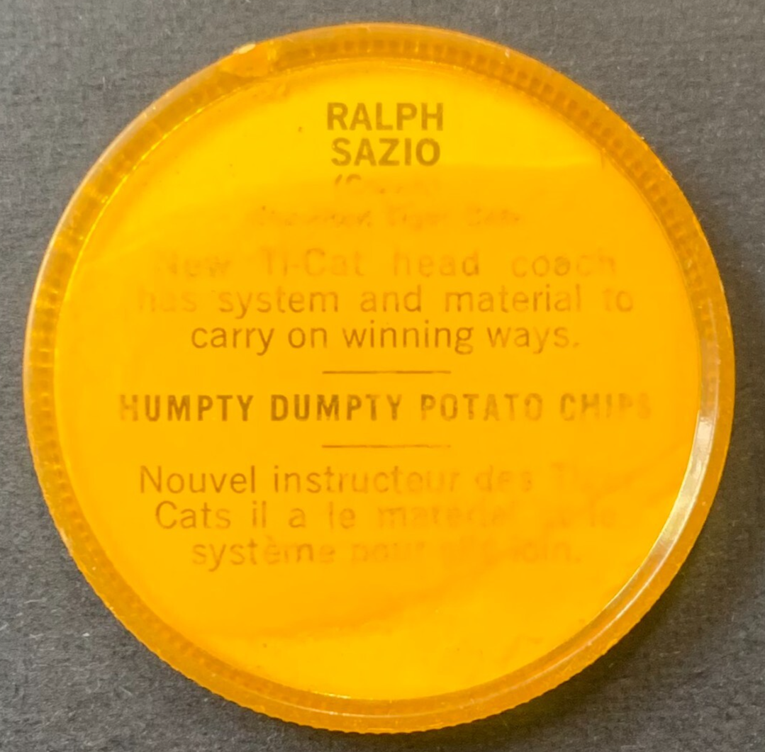 - 1963 Nalleys CFL Coin #58 Ralph Sazio Hamilton Tiger Cats Humpty Dumpty Football