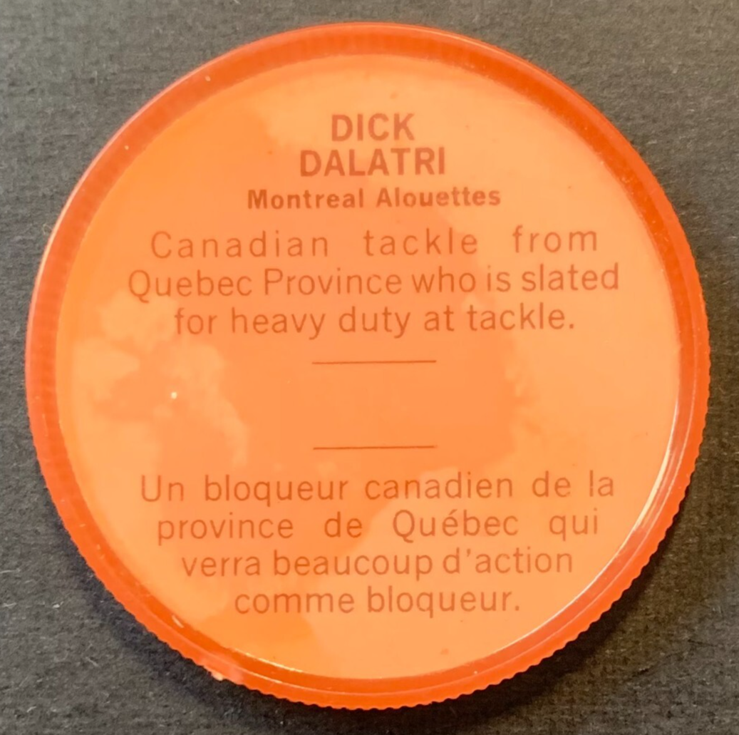 - 1963 Nalleys CFL Coin #74 Dick Dalatri Montreal Alouettes Anonymous Back (Bilingual) Football