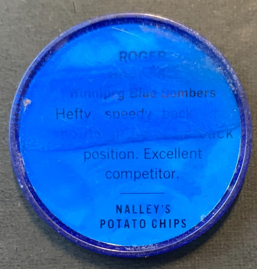 • 1963 Nalleys CFL Coin #91 Roger Hagberg Winnipeg Blue Bombers Nalley's Football