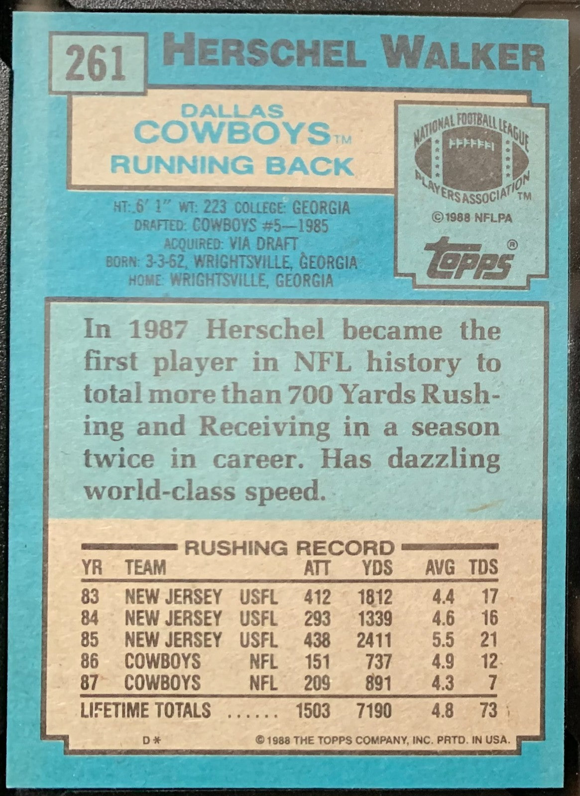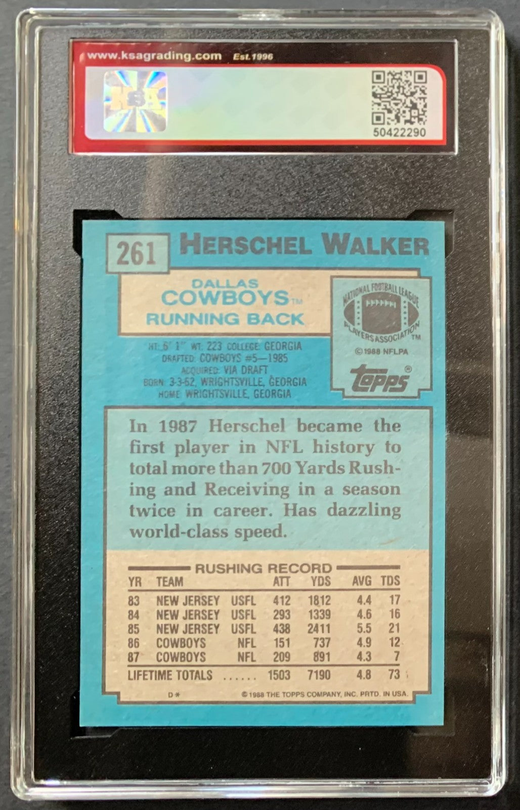 - 1988 Topps #261 Herschel Walker Football Card KSA 7.5 NM+