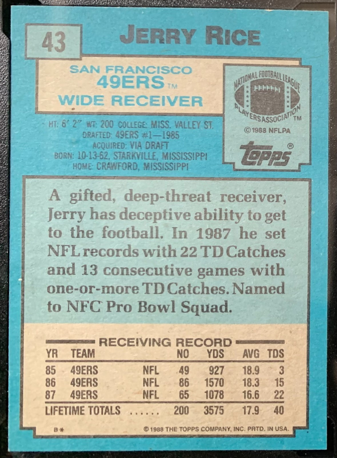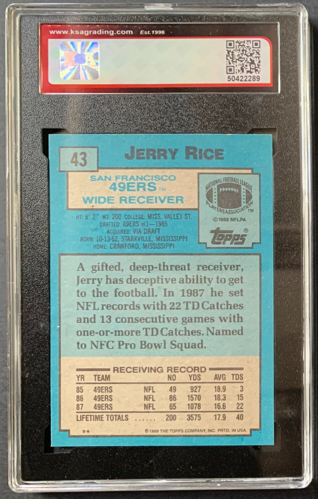 - 1988 Topps #43 Jerry Rice Football Card KSA 7 NM