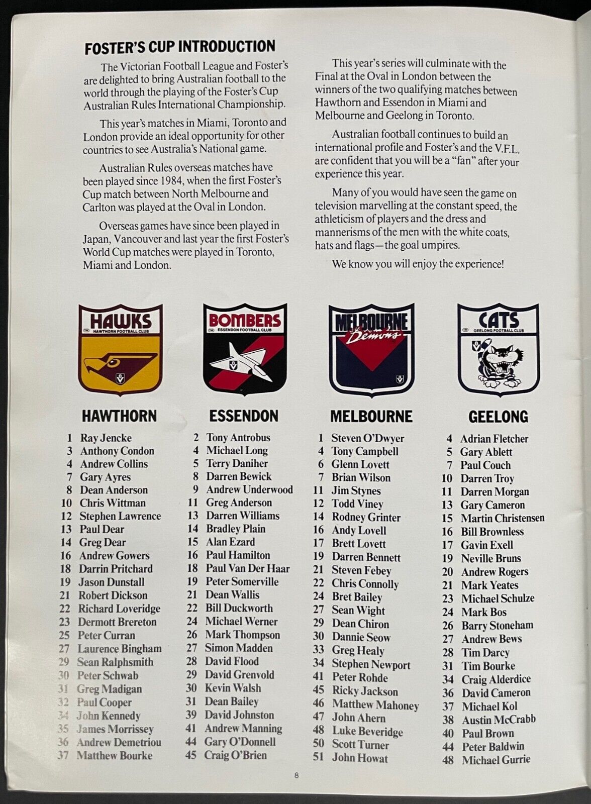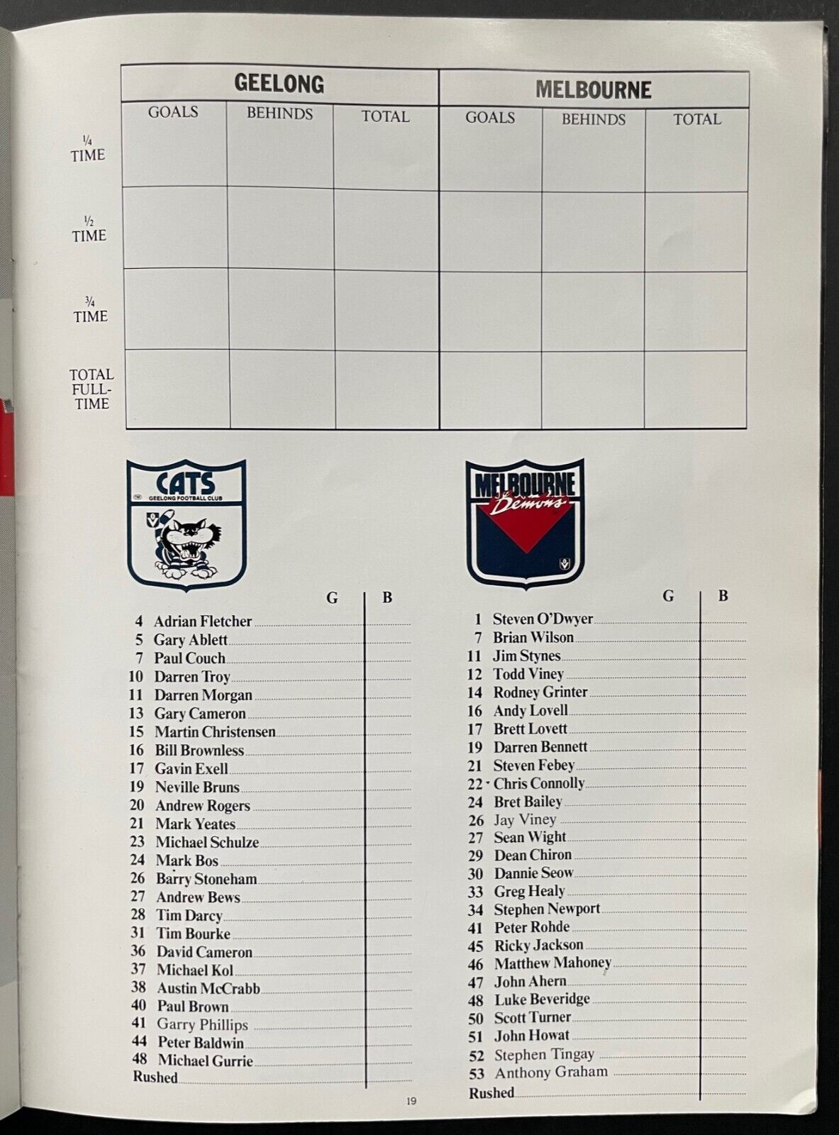 - Fosters Cup AFL game program between the Geelong Cats and the Melbourne Demons at the Skydome in Toronto on October 12, 1989. Demons won the exhibition match 14.19 (103) to 13.12 (90) over the Cats. This tournament came shortly after Geelong lost to Hawthorn in the AFL Grand Final. Lineups include key players Gary Ablett Sr., Paul Couch, Neville Bruns for the Cats, as well as Jim Stynes and Greg Healy for the Demons