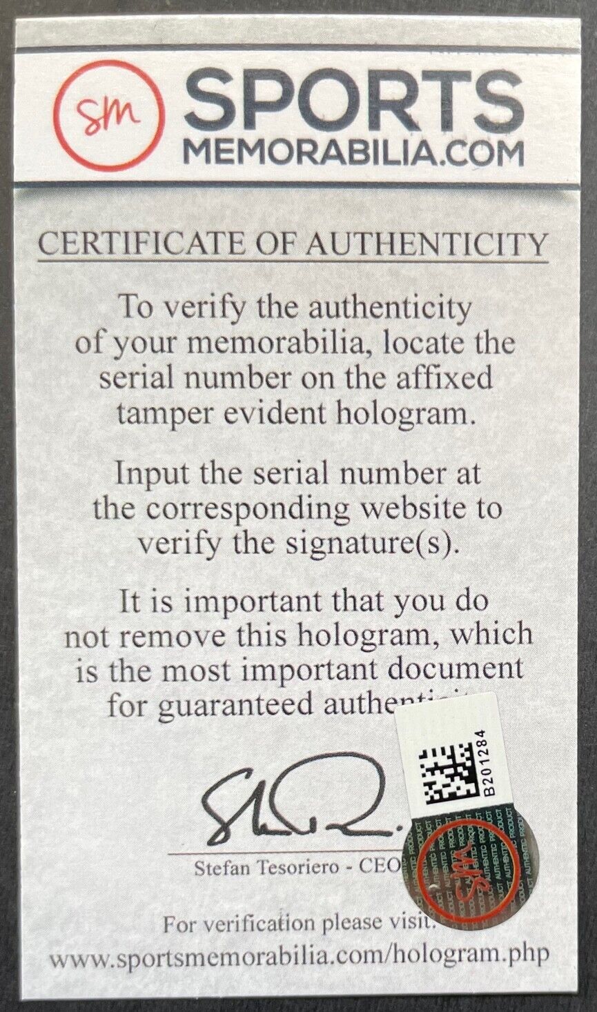 - SportsMemorabilia.com certification #B201284