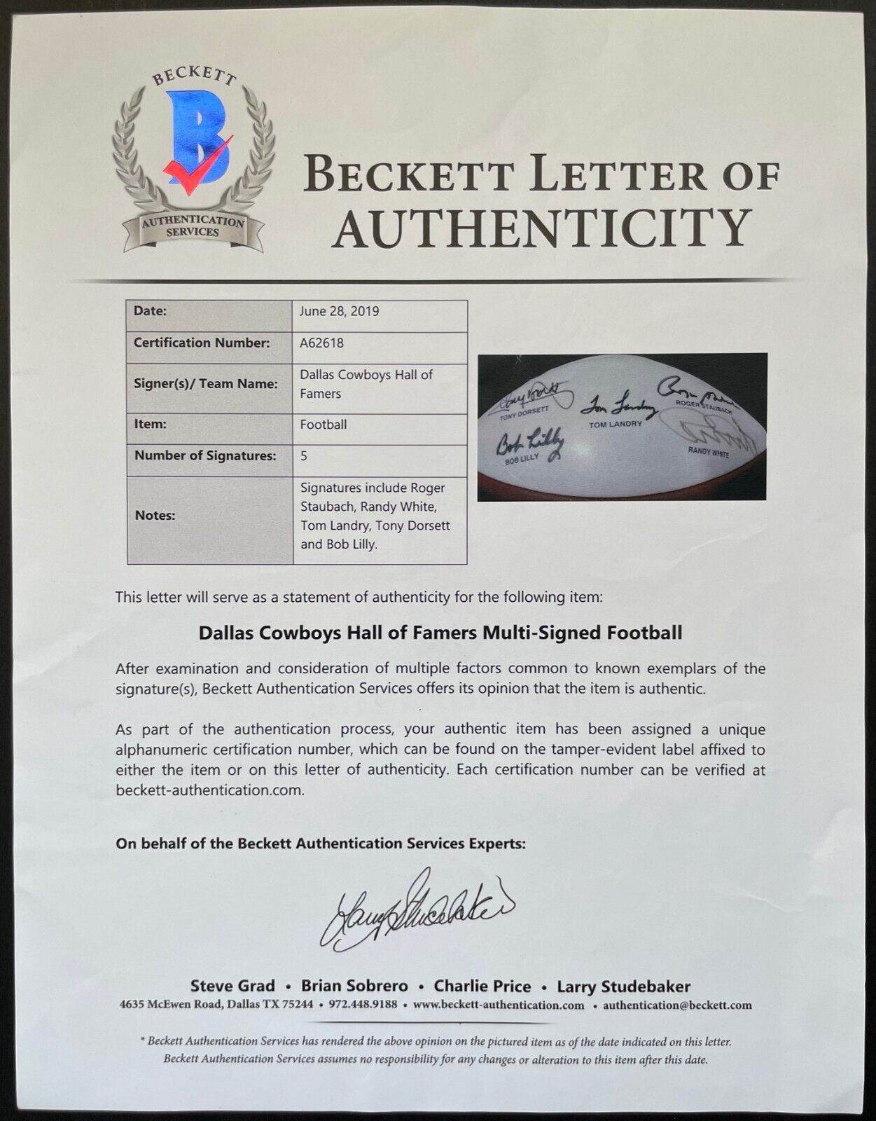 - Football signed by Cowboys Hall of Fame legends Tony Dorsett, Bob Lilly, Tom Landry, Roger Staubach and Randy White