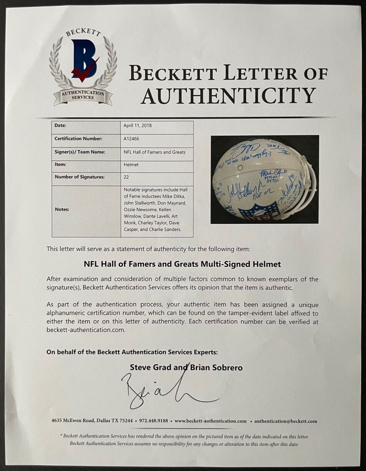 • Beckett witnessed and authenticated - Cert #A12466