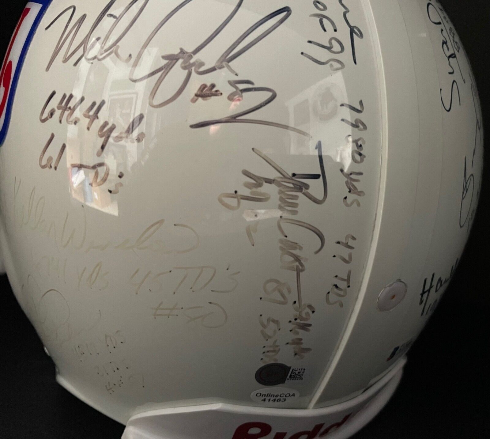 • Very good condition; bottom and right hand side of the left panel show notable fading, affecting the autographs of Winslow, Casper, Sanders and Carmichael and lightly affecting Newsome and Hill’s autographs. Otherwise, autographs present very well with little to no notable smudging, bleeding or fading with the odd small scratch on the helmet slightly affecting signatures.