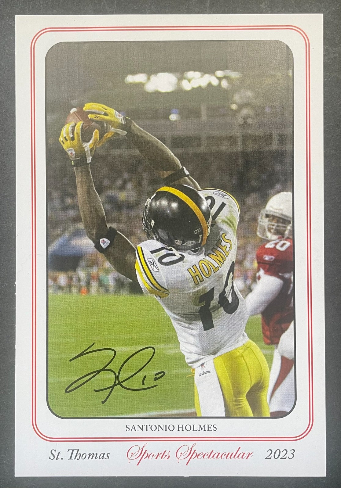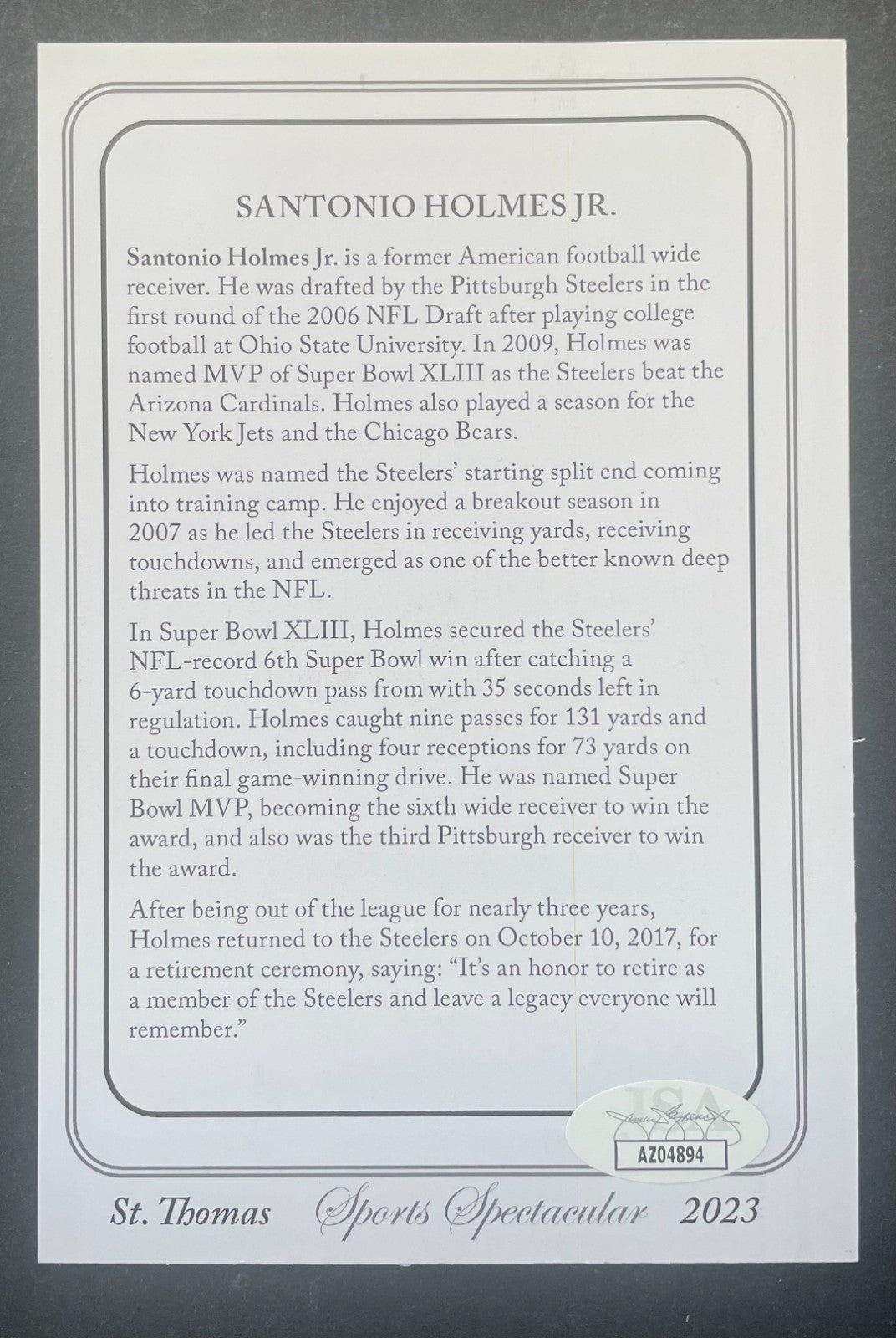 - Card shows Holmes catching the game-winning touchdown vs the Arizona Cardinals in Super Bowl XLIII. Santonio was named Super Bowl MVP.