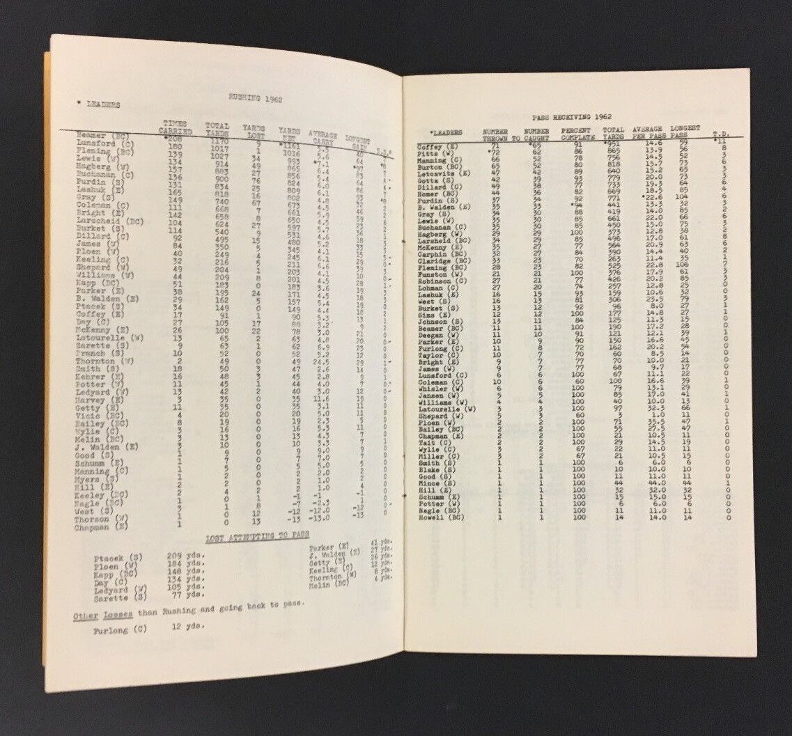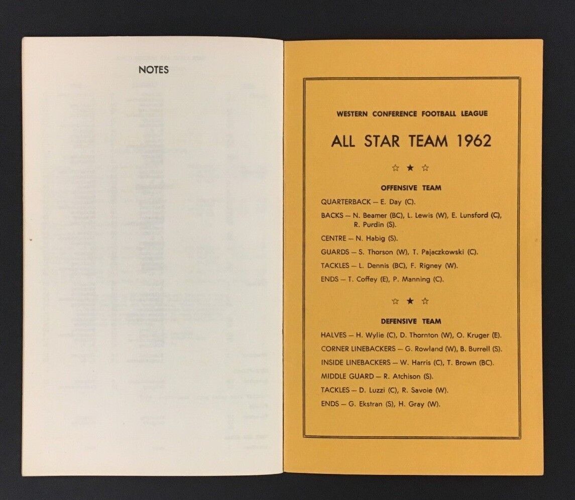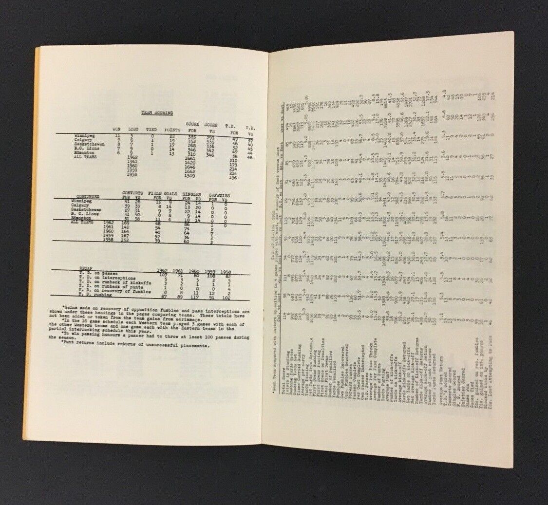 • Rare 1962 CFL guide Western Conference Football League statistics featuring on the cover 5 teams the Winnipeg Blue Bombers, Calgary Stampeders, Saskatchewan Rough Riders, B.C Lions and the Edmonton Eskimos