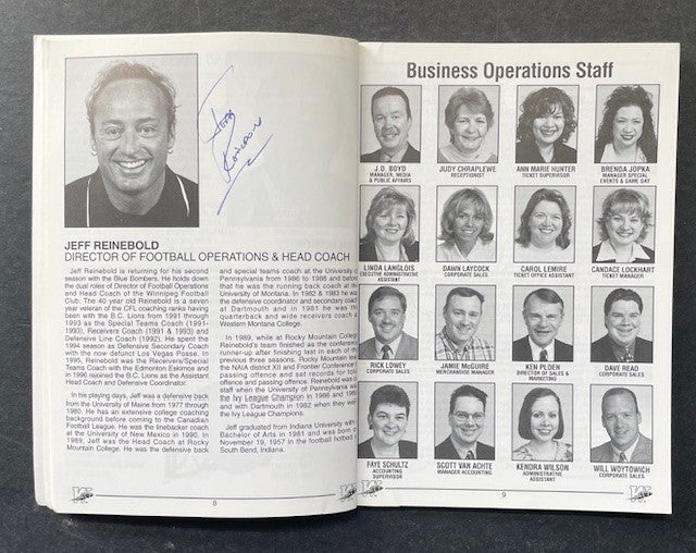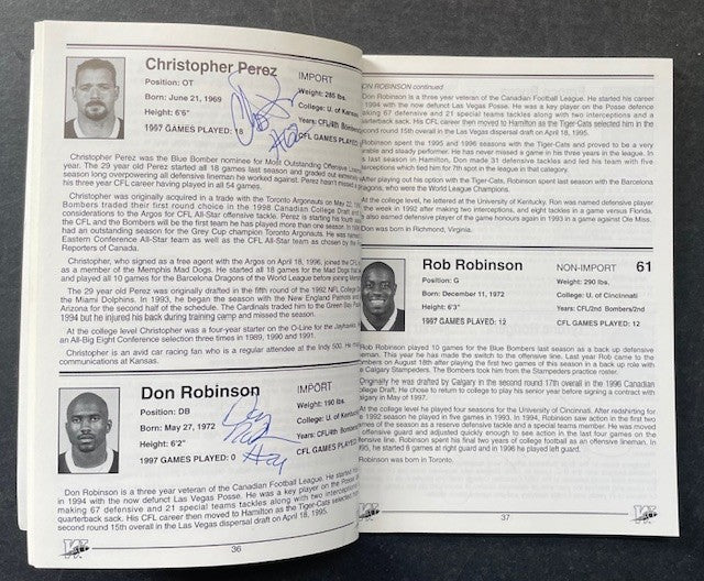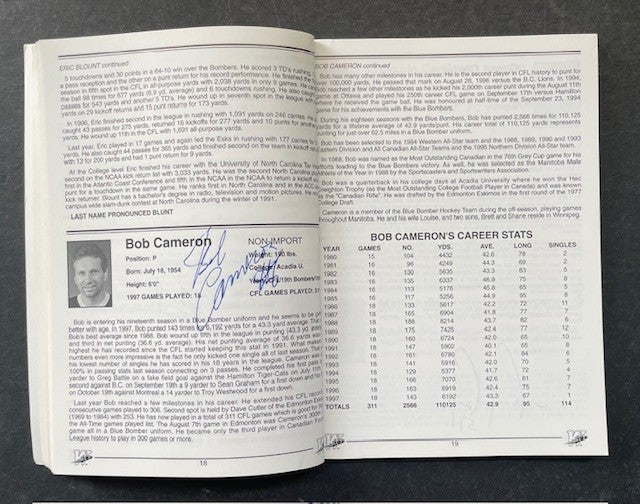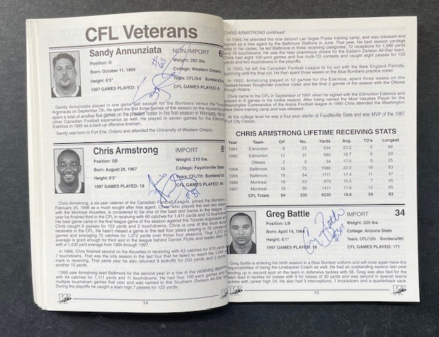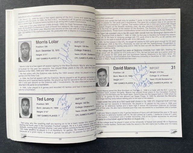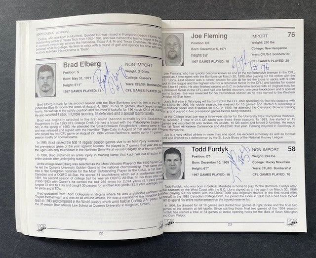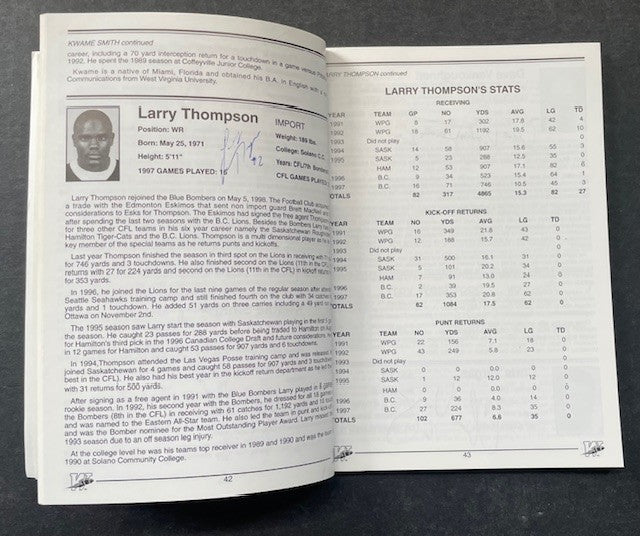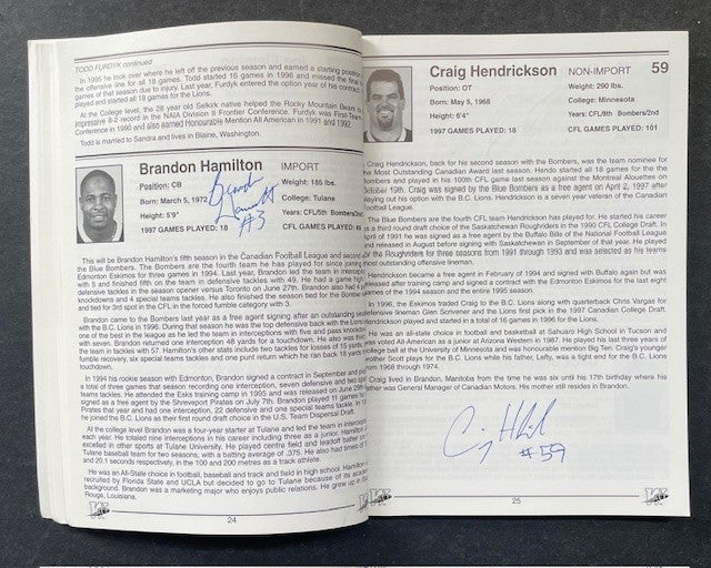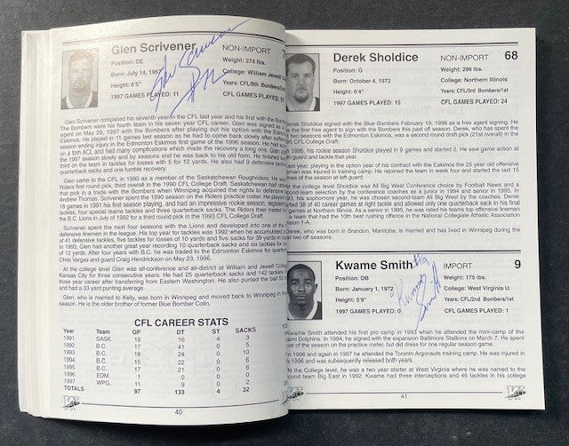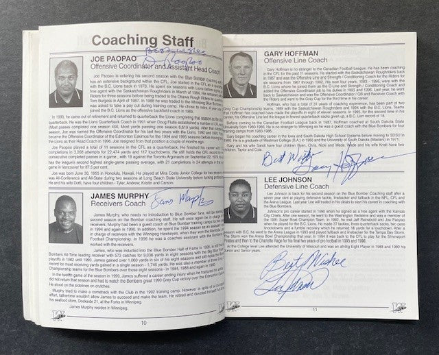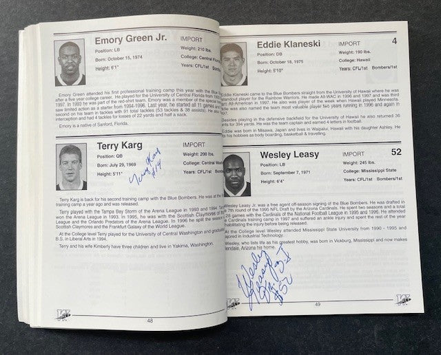 1998 Winnipeg Blue Bombers CFL Media Guide Signed By 48 Players Next To Bio