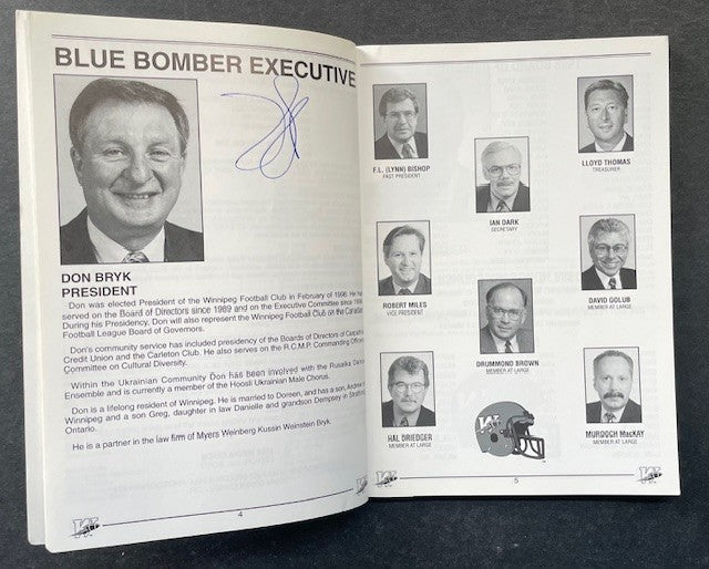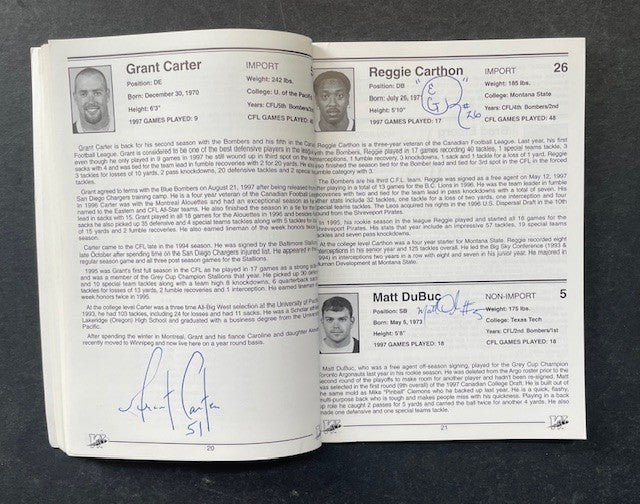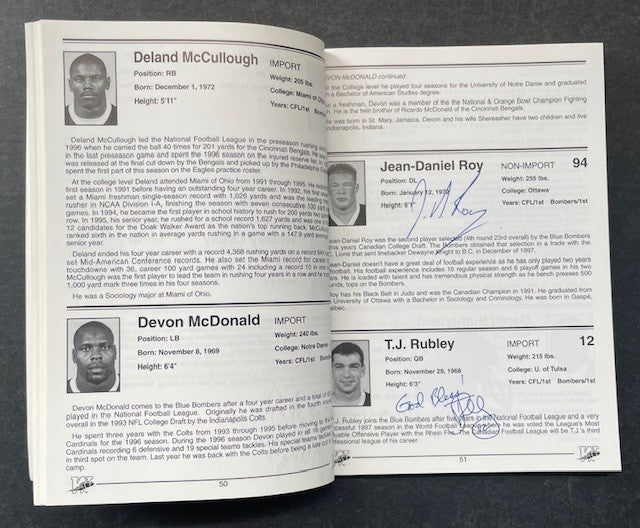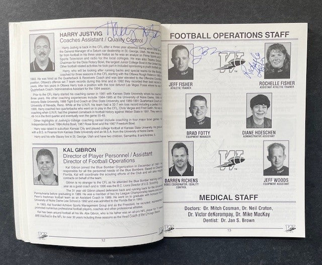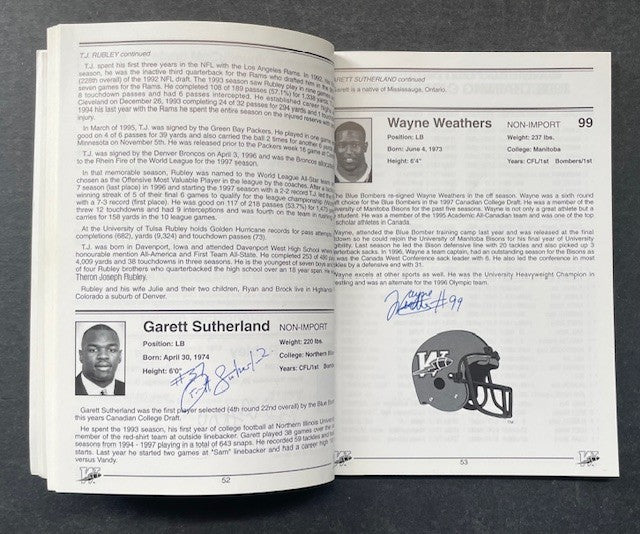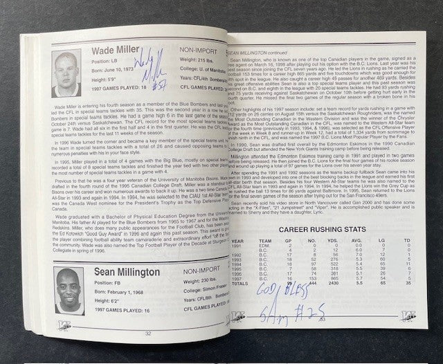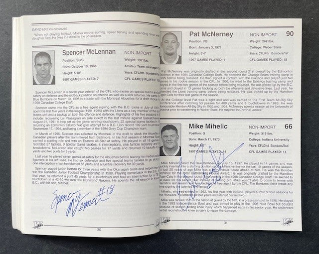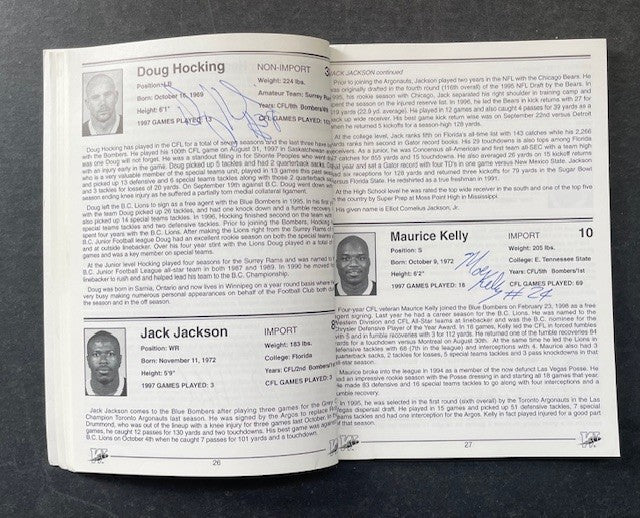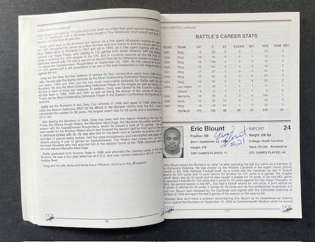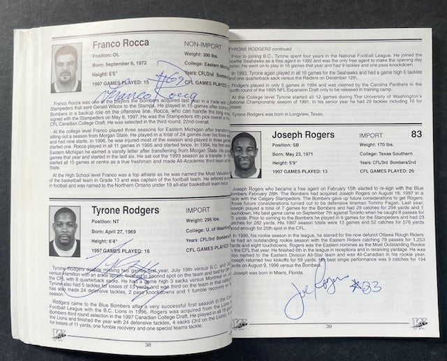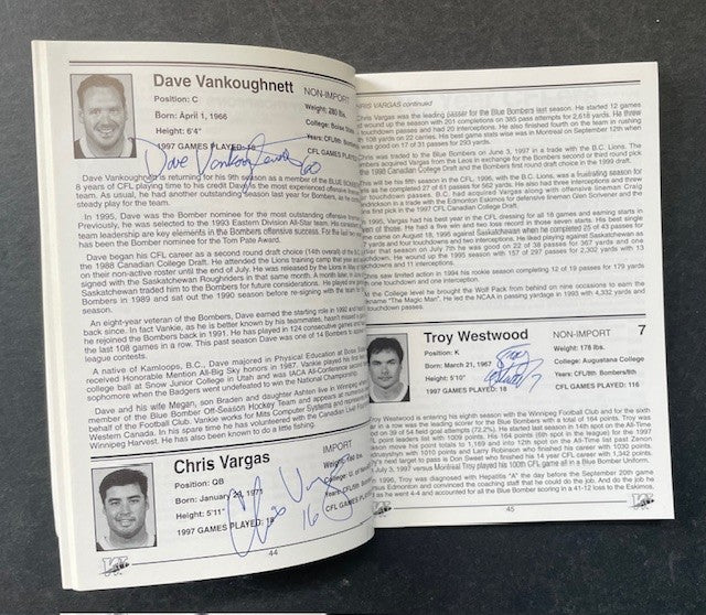 1998 Winnipeg Blue Bombers CFL Media Guide Signed By 48 Players Next To Bio