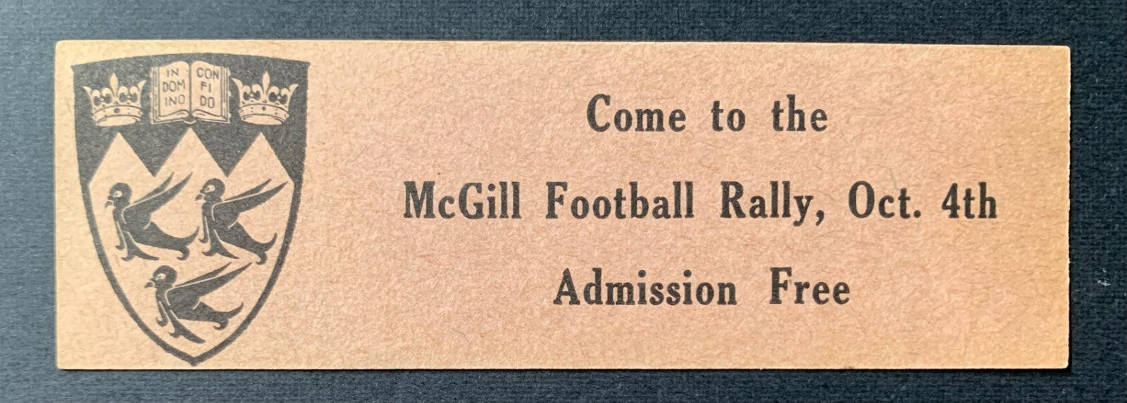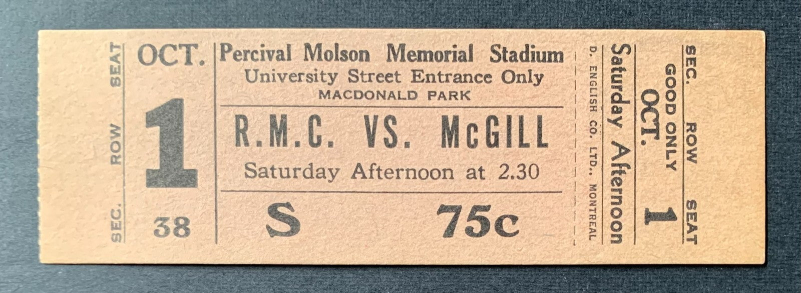 - Unused ticket from Oct. 1, 1938 football game. McGill beats Military College on its way to the 1938 Canadian College Championship
