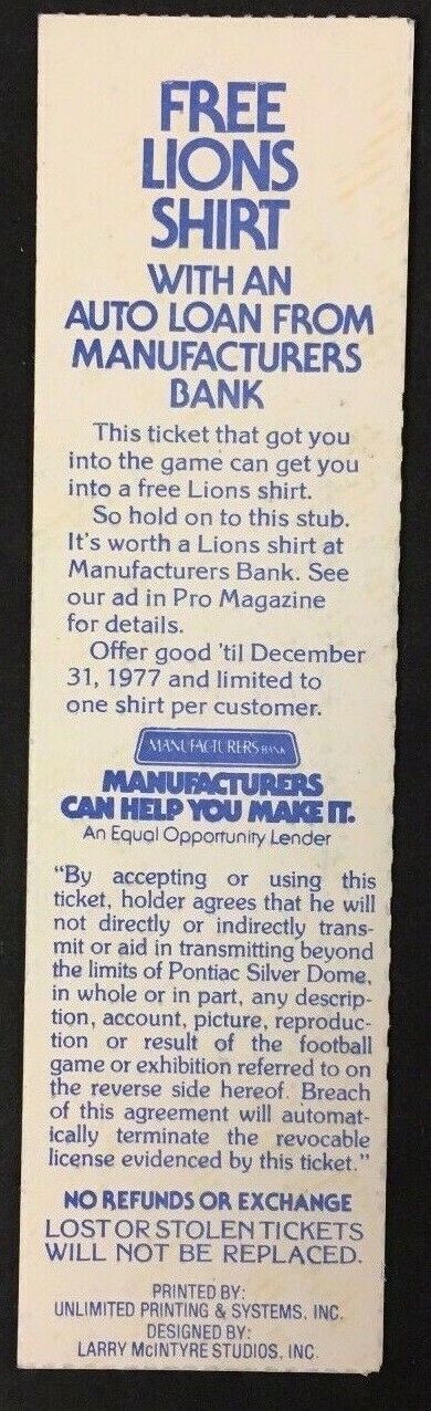 - November 6, 1977 Gameday ticket for the Detroit Lions v. San Diego Chargers at the Pontiac Silverdome in Detroit
