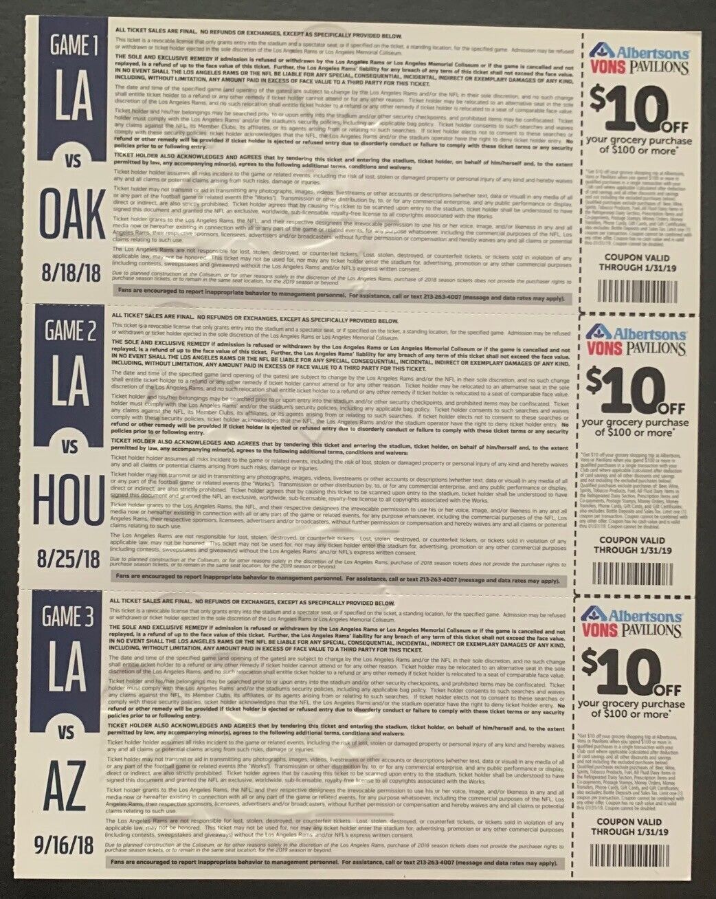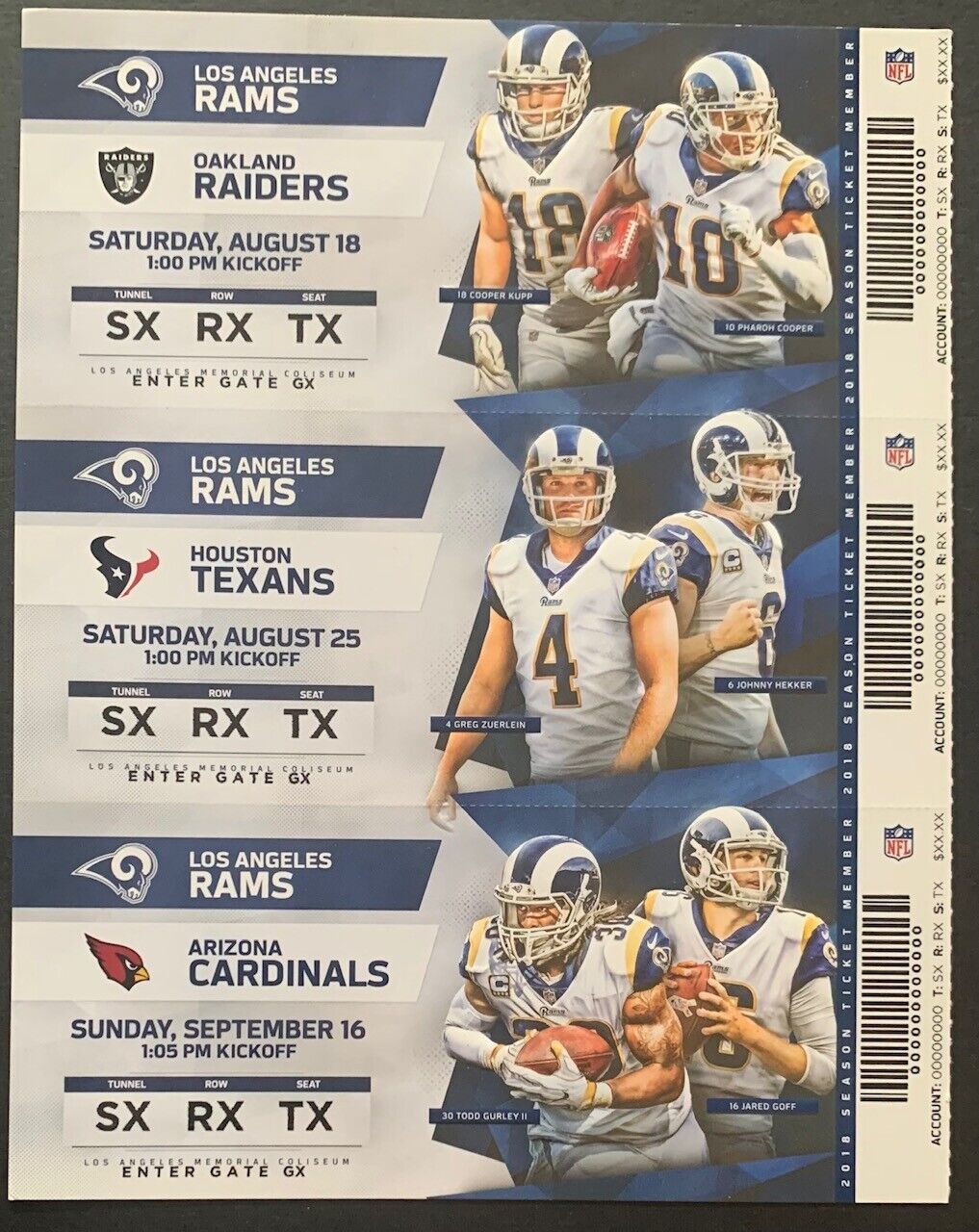 - Eleven 2018 Los Angeles Rams proof tickets featuring multiple players including 2021 Super Bowl MVP Cooper Kupp