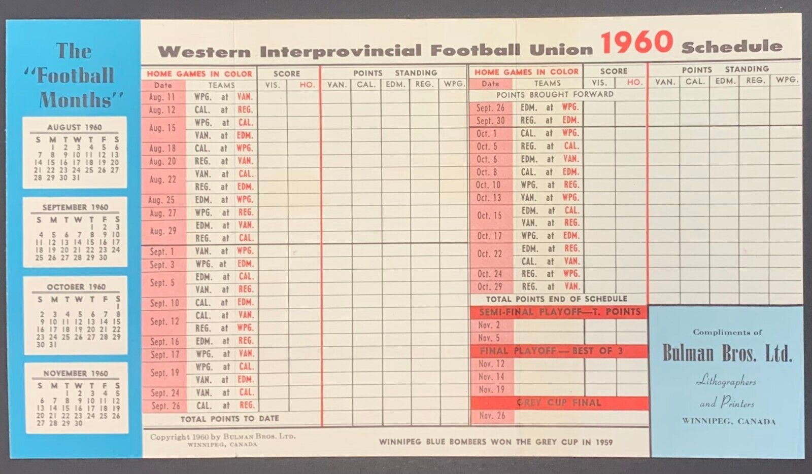 - 1960 Western Interprovincial Football Union pocket schedule produced by Bulman Bros