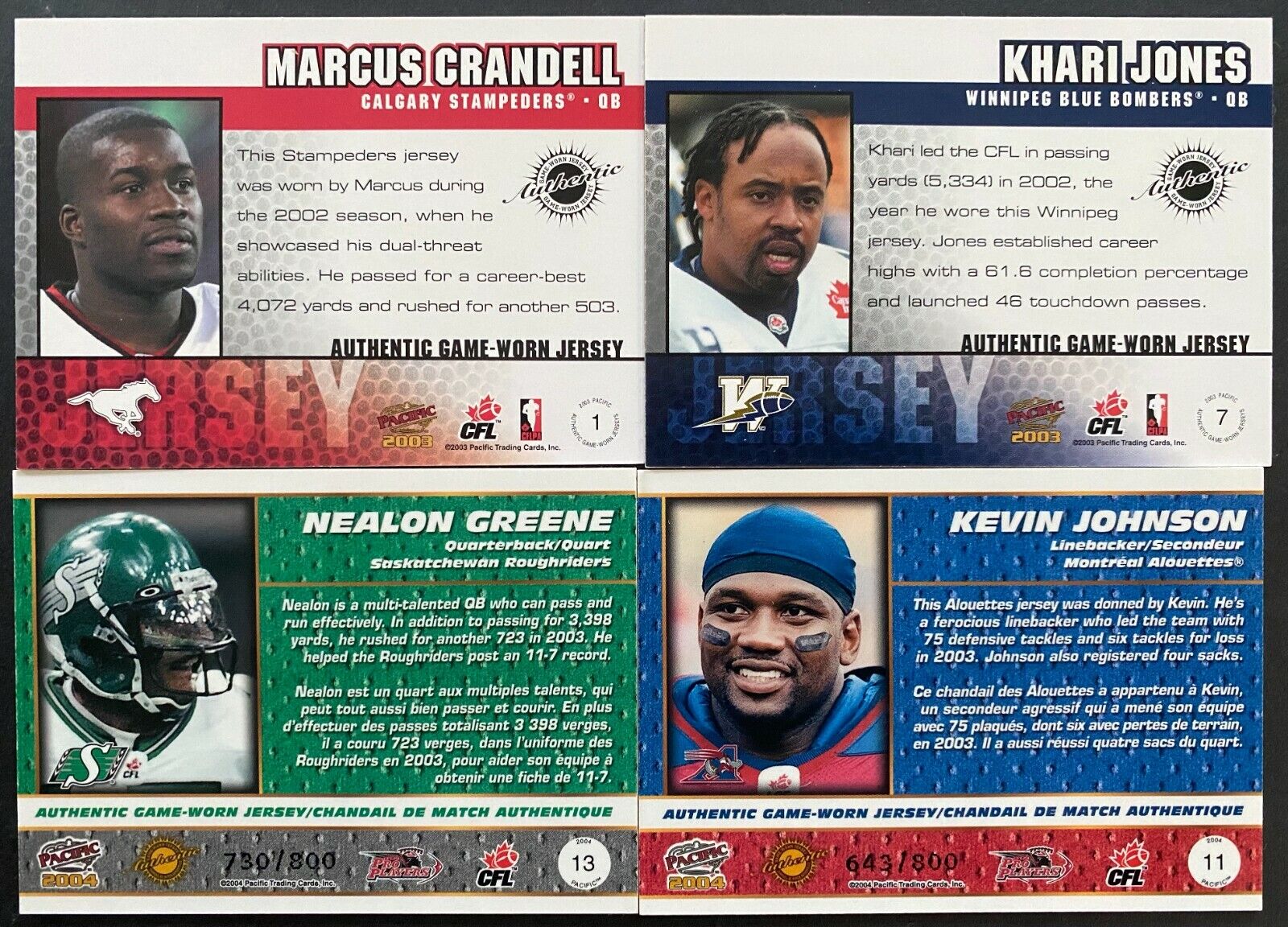 - 2003 cards are Quarterback Khari Jones of the Winnipeg Blue Bombers and Quarterback Marcus Crandell of the Calgary Stampeders