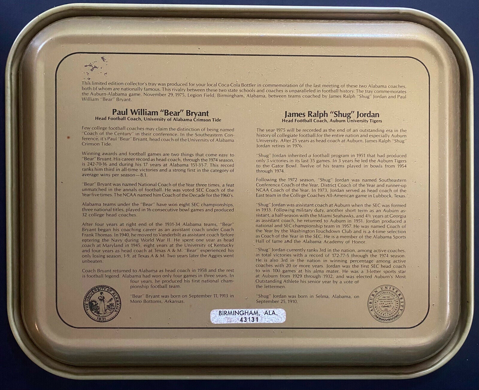 • Alabama vs Auburn Coca Cola tray issued to celebrate November 19th 1975 NCAA Football game at Legion Field