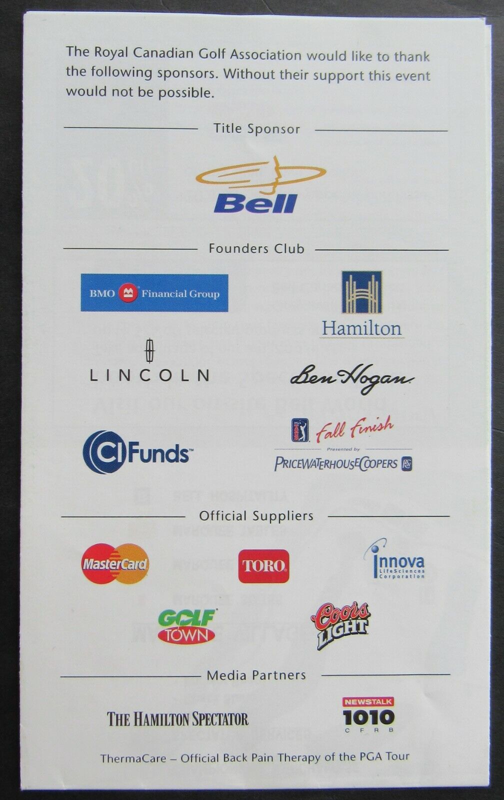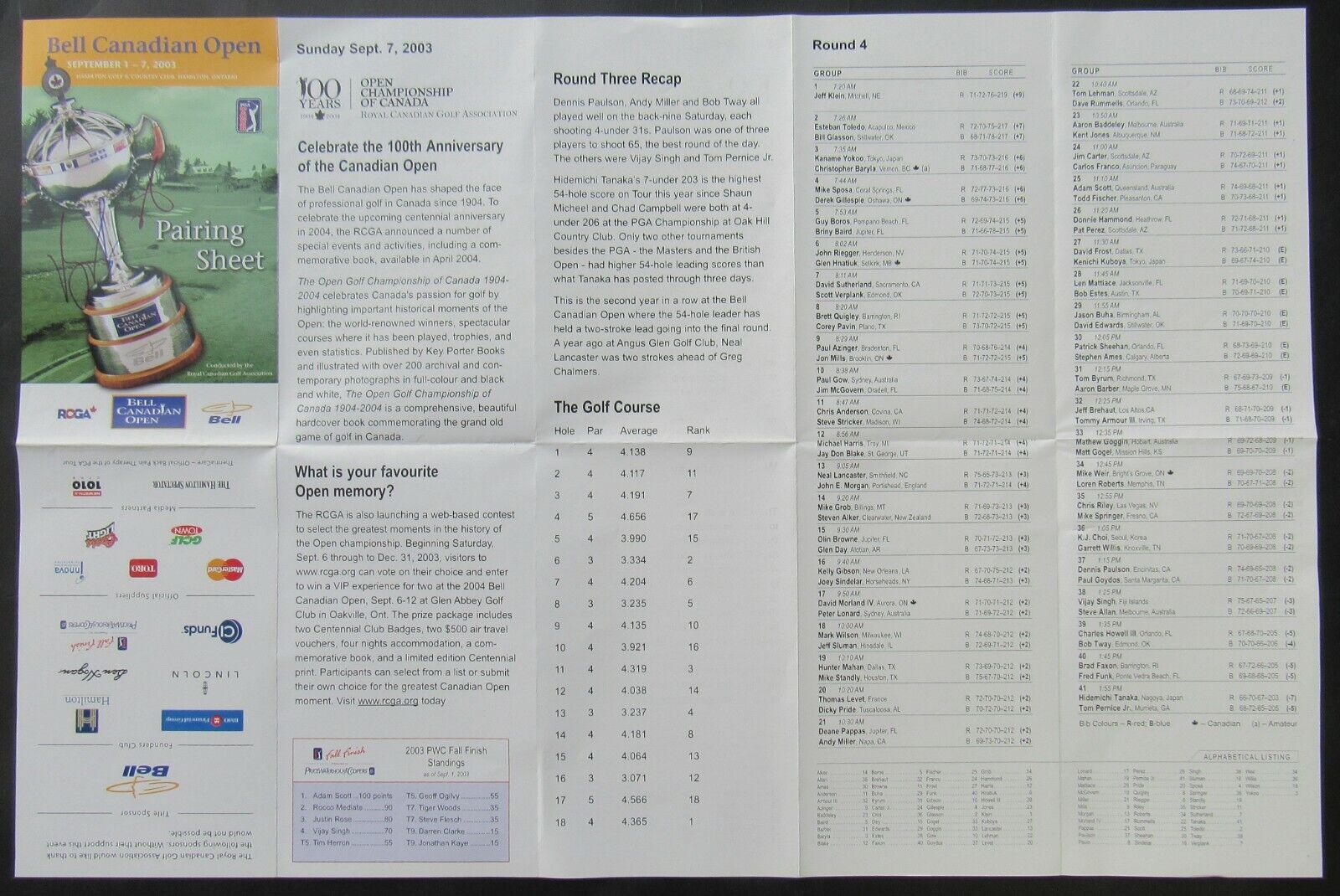 - September 7, 2003 Canadian Open golf Tournament Final day pairing Sheet Autographed By Golf Great Vijay Singh @ Hamilton Golf & Country Club, Ontario