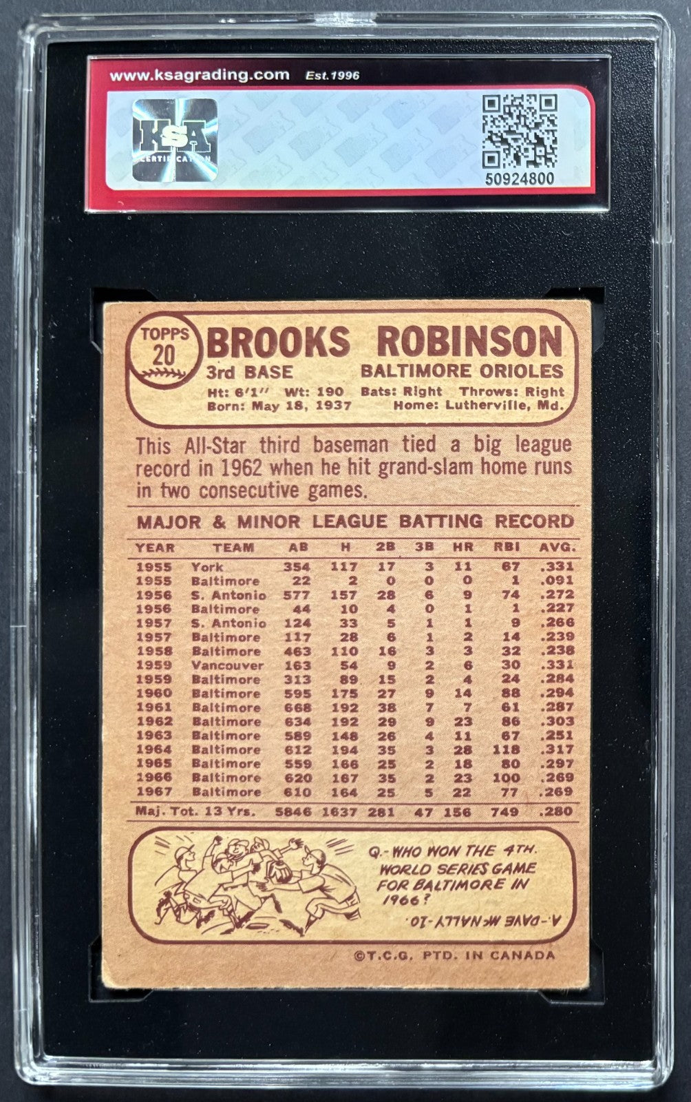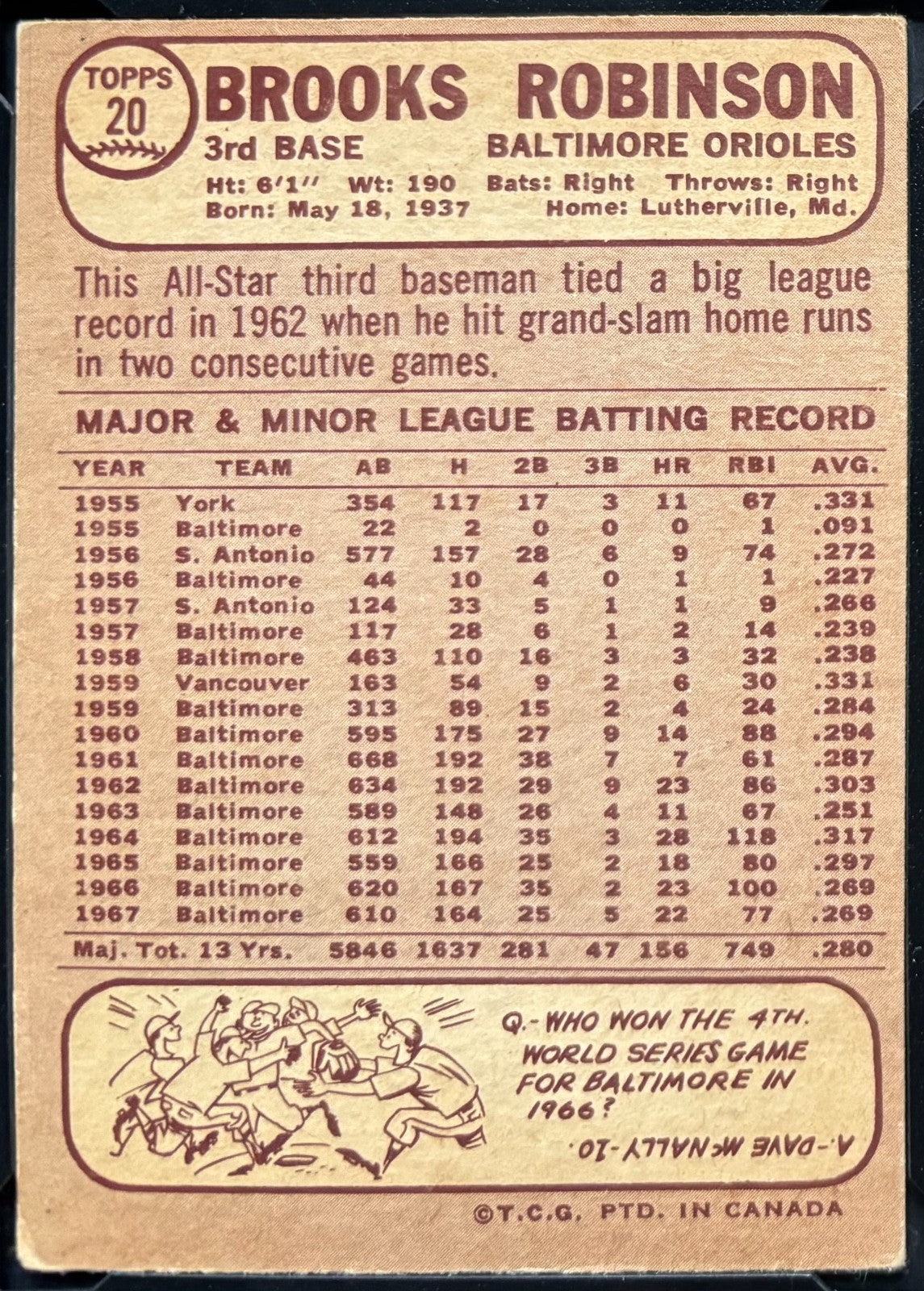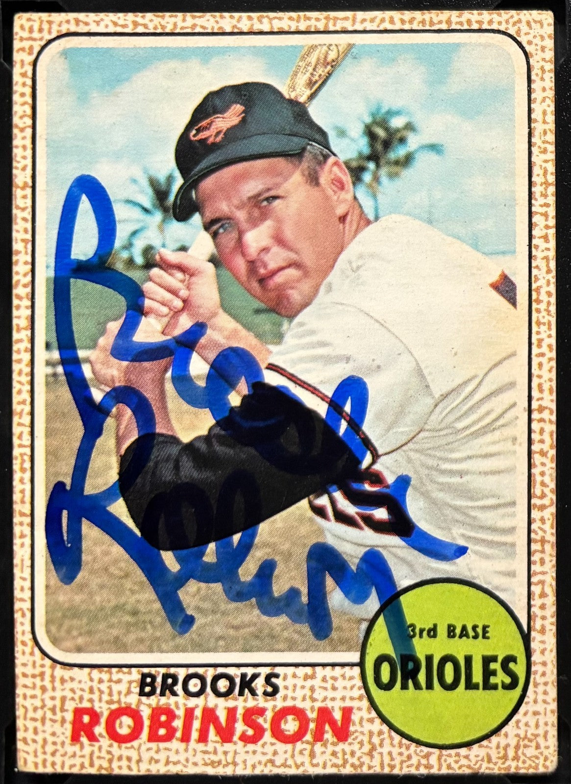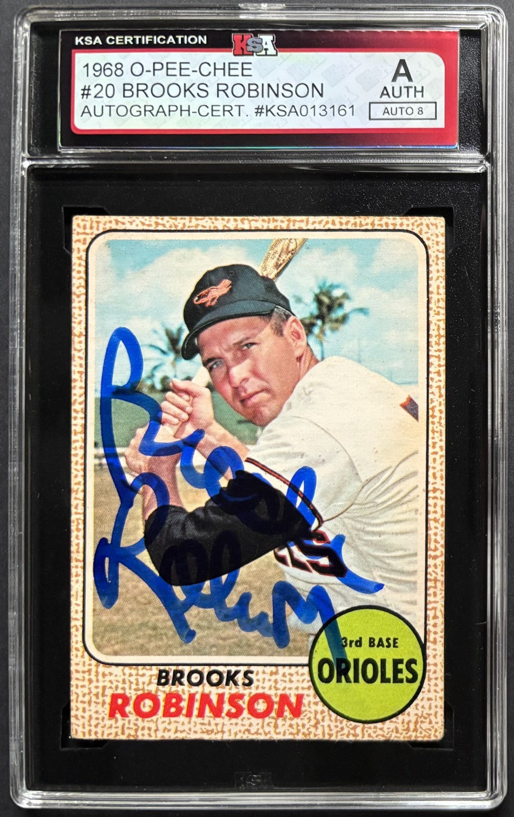 - 1968 O-Pee-Chee #20 Brooks Robinson baseball card, hard signed in blue marker by Robinson