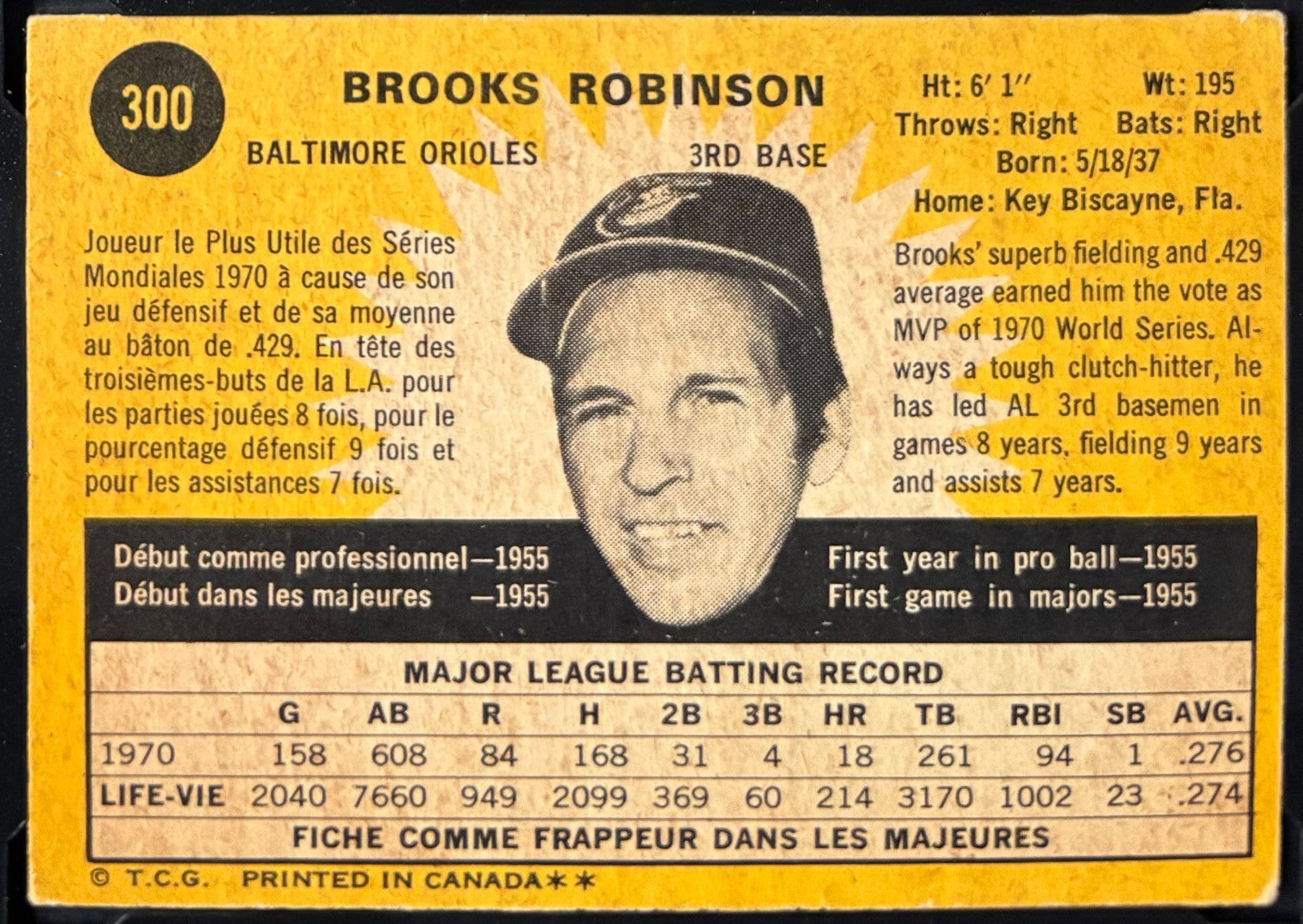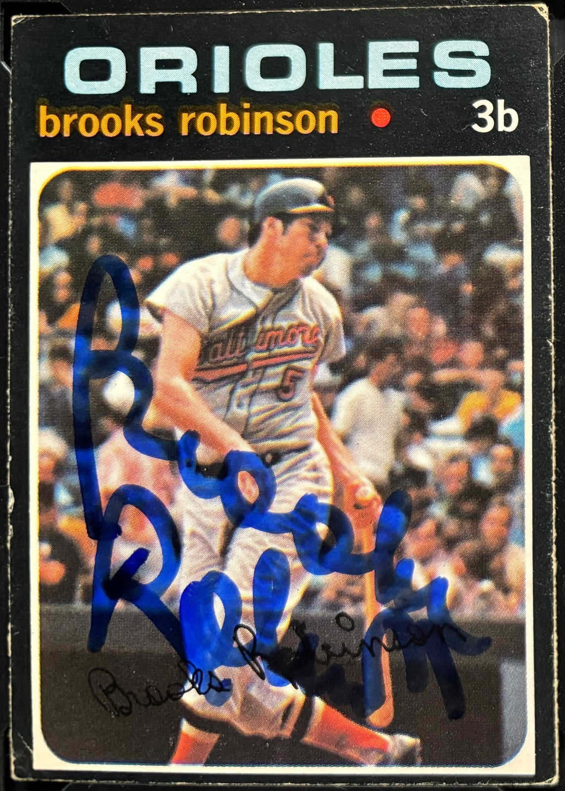 • 1971 O-Pee-Chee #300 Brooks Robinson baseball card, hard signed in blue marker by Robinson